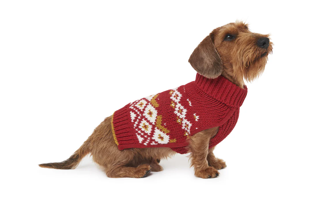 每年12月的第三個星期五都是醜毛衣日,到近年已成為時尚界傳統,人寵一起穿的造型威力更是倍增。一件醜毛衣需要具備手工編織感,最好同時兼具紅、白與綠三種象徵聖誕顏色,老氣橫秋的傳統鉤花是精髓所在,穿在寵物身上更具反差萌。