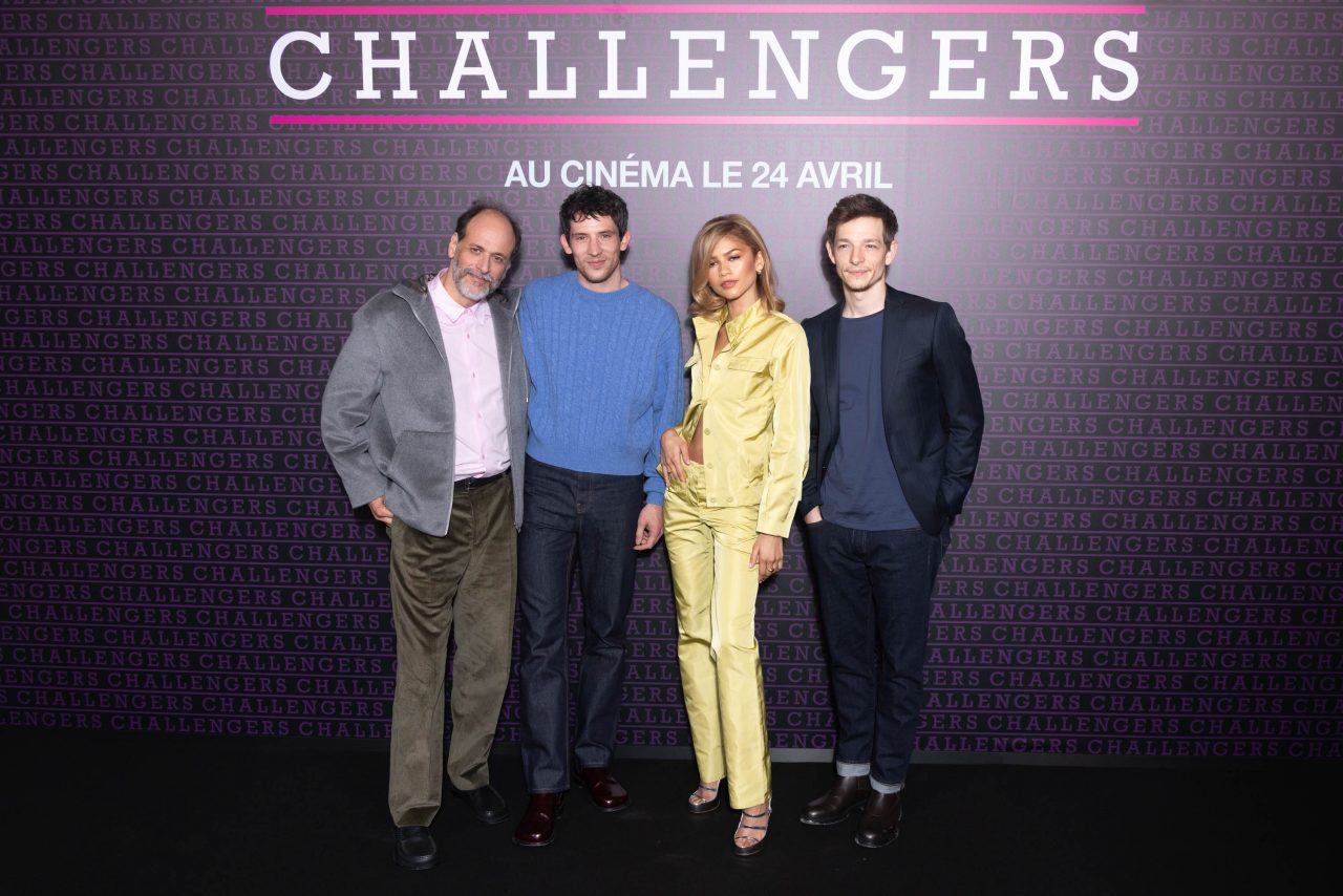 PARIS, FRANCE - APRIL 06: (L-R) Luca Guadagnino, Josh O’Connor, Zendaya and Mike Faist attend the "Challengers" Paris Premiere at UGC Normandie on April 06, 2024 in Paris, France. (Photo by Kristy Sparow/Getty Images)