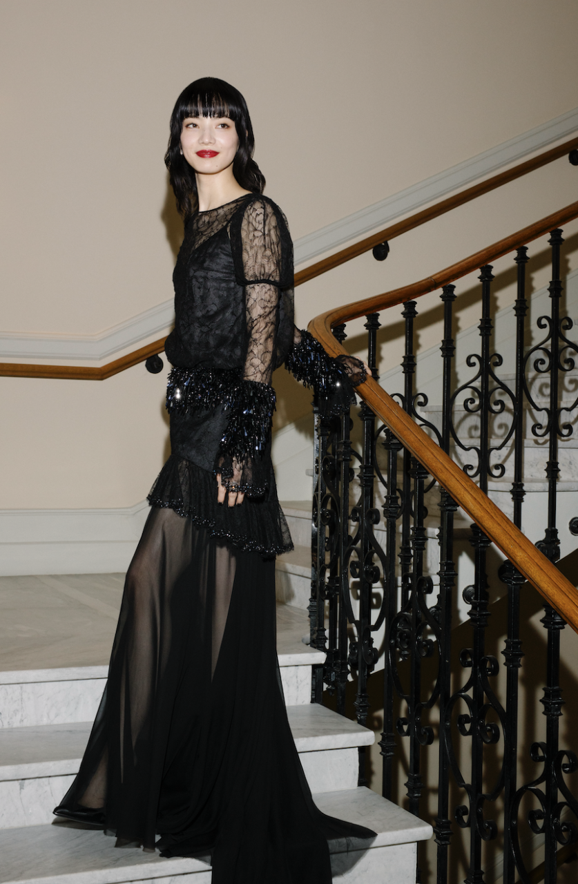 她身穿CHANEL 2025春夏系列的黑色透視長裙,搭配及肩的黑髮瀏海造型,完美散發出全新的法式優雅。這一造型除了突顯了她的個性,也彰顯了當代女性的自信與魅力,讓人不禁讚嘆其時尚及美容品味。小松菜奈的演繹無疑為經典紅唇妝容注入了新活力,讓這一傳統妝容在現代依然熠熠生輝!