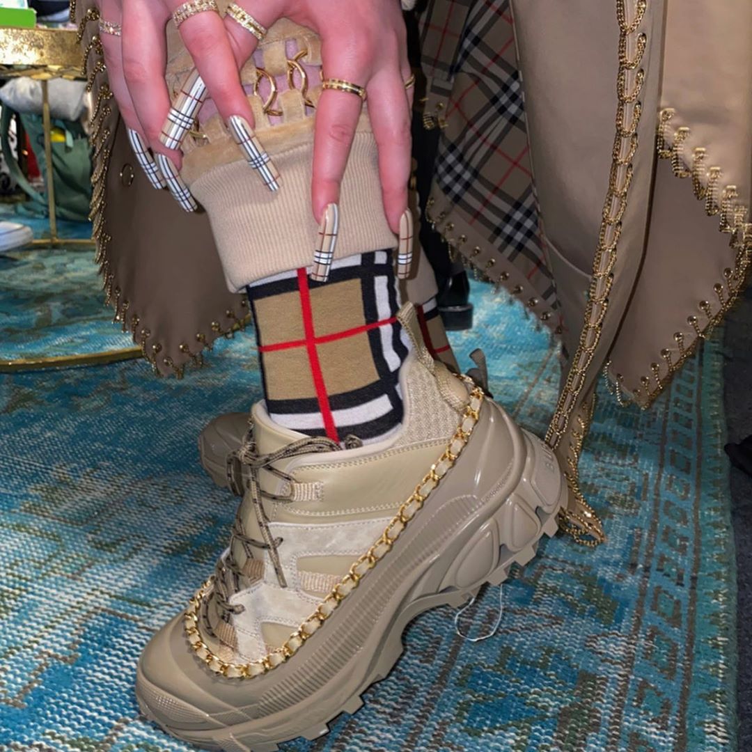 最近時尚品牌的Logo和標誌性風格成為指甲熱潮,繼Chanel在時裝展的模特兒指甲貼上品牌名字而成為熱話,Billie Eilish亦是品牌指甲的代表。早前以一身Burberry的造型出席Brit Awards,一貫的長方形甲形配以品牌格仔標誌,立即提昇整體造型,甚至比衣著更搶眼。