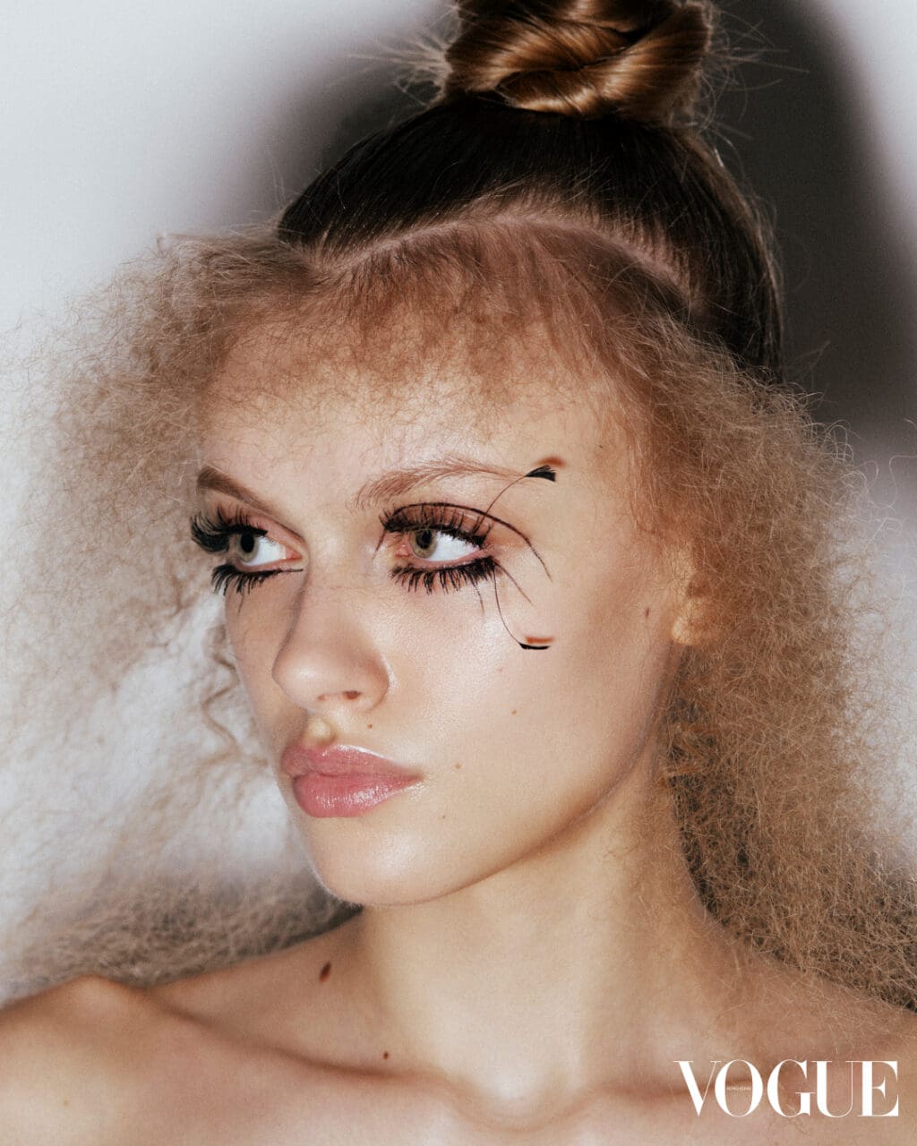 除了 90 年代回歸外,浮誇的娃娃睫毛也是眼妝亮點,Harris Reed 的時裝展是這個趨勢的代表。首席化妝師 Sofia Tilbury 不單於天橋上為模特兒設計出心型嘴唇,更利用誇張的假眼睫毛和搶眼的眼影打造出奪目的彩妝,把模特兒變成了洋娃娃。