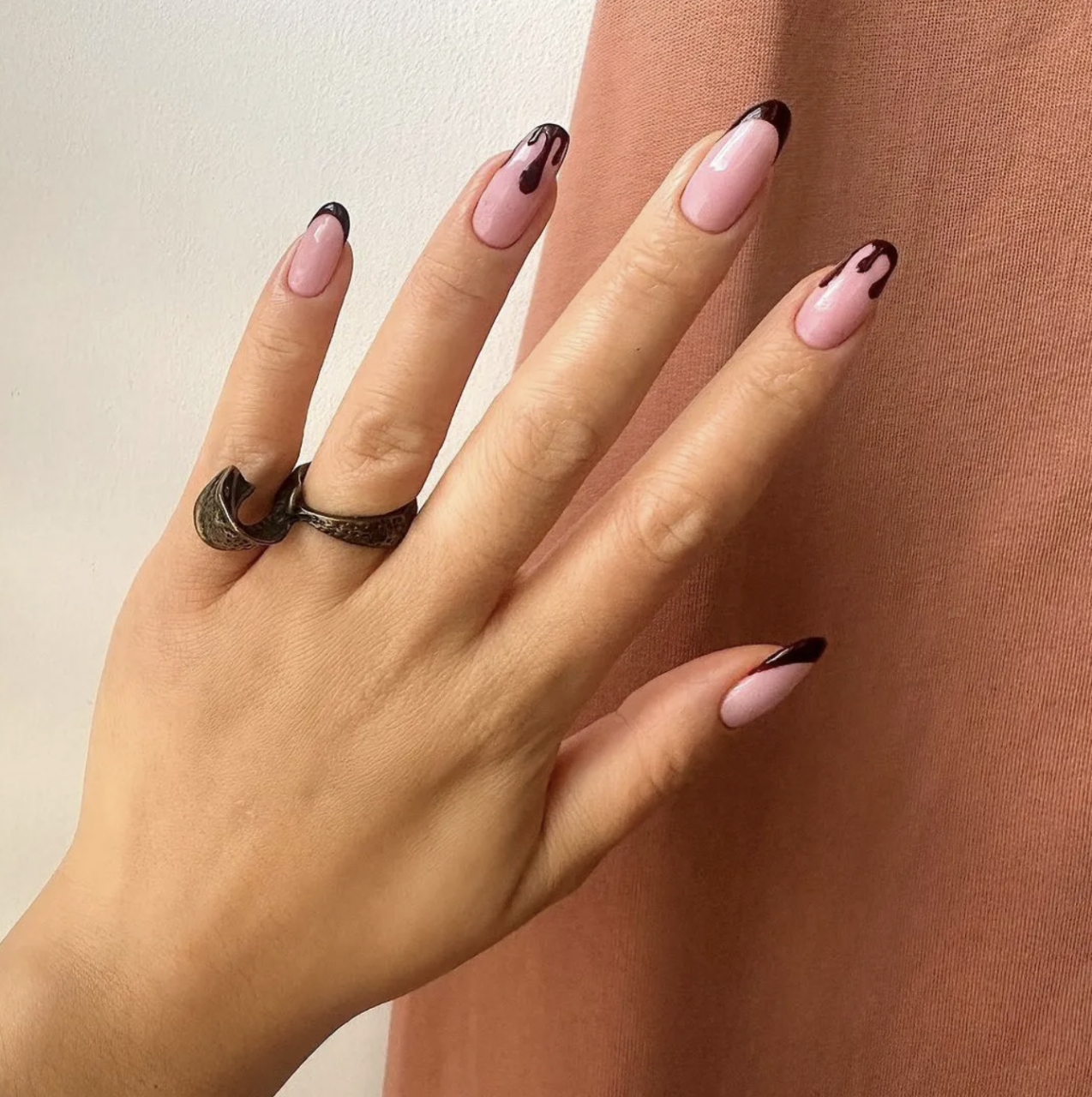 說到小眾的萬聖節設計,沒有人比Michelle Humphrey(更廣為人知的名字是 @nailsbymh)做得更好。 這位名人美甲師和美甲創意人士喜歡在陰森的季節跳出框框思考,這意味著她的設計既富有想像又別緻。 「顯然萬聖節是玩樂的季節,但我真的很喜歡讓它感覺更成熟,而不是顯而易見,」Michelle Humphrey說。「我的客戶不喜歡在指甲上搖晃南瓜或鬼魂,更可能是深色的元素,比如煙熏黑色漸變色、黑色閃光法式,或者看起來有點奇怪的東西,例如漏油」。