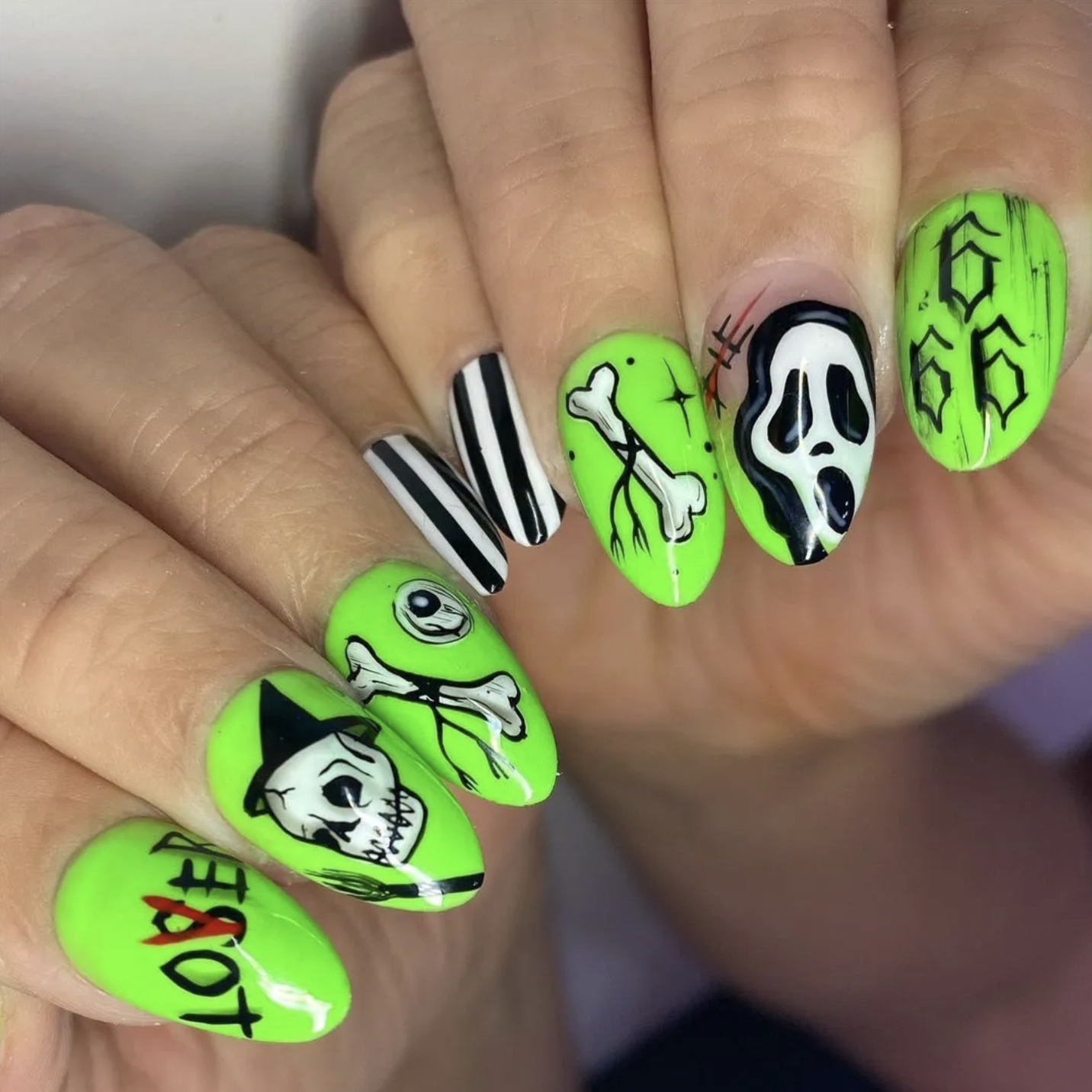 Marbles Valdez的作品融合了卡哇伊可愛、超大貼花和彩色印花,毫不迴避地表達了你每年這個時候想要的那種風格。 她的幽靈指甲首選顏色是綠色、橙色、黑色和紫色。 「我喜歡 Valentino和Madam Glam的指甲油」。