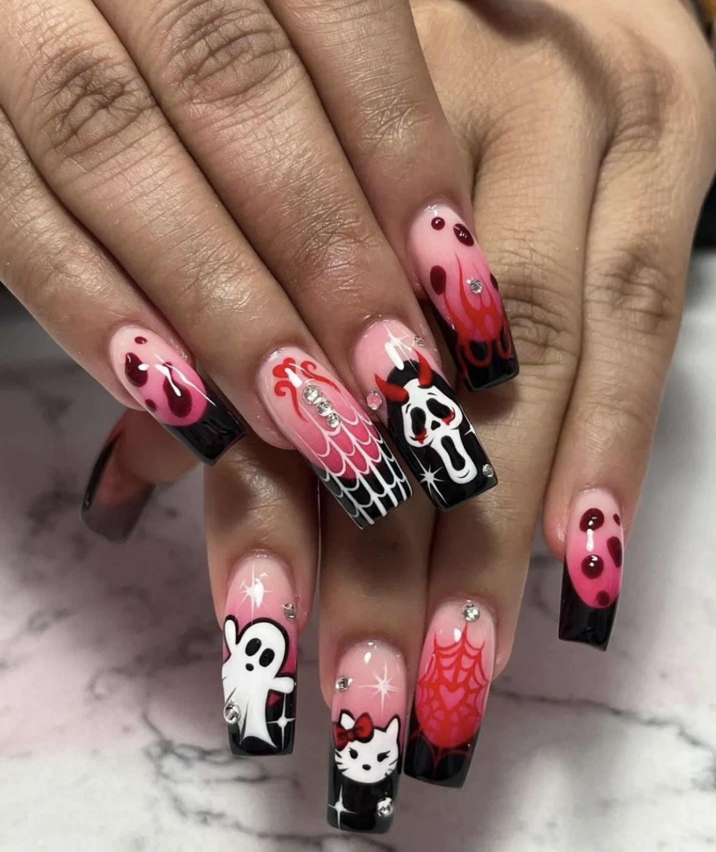 僅僅因為今天是萬聖節,並不意味著你必須全力以赴。 事實證明,尖叫的粉紅色鬼面看起來有點可愛。 「我最受歡迎的萬聖節設計通常是蜘蛛、網、《驚聲尖叫》等恐怖電影以及任何類似血的東西,」下東區MVZ Beauty Studio的創辦人和藝術家Marbles Valdez說道。