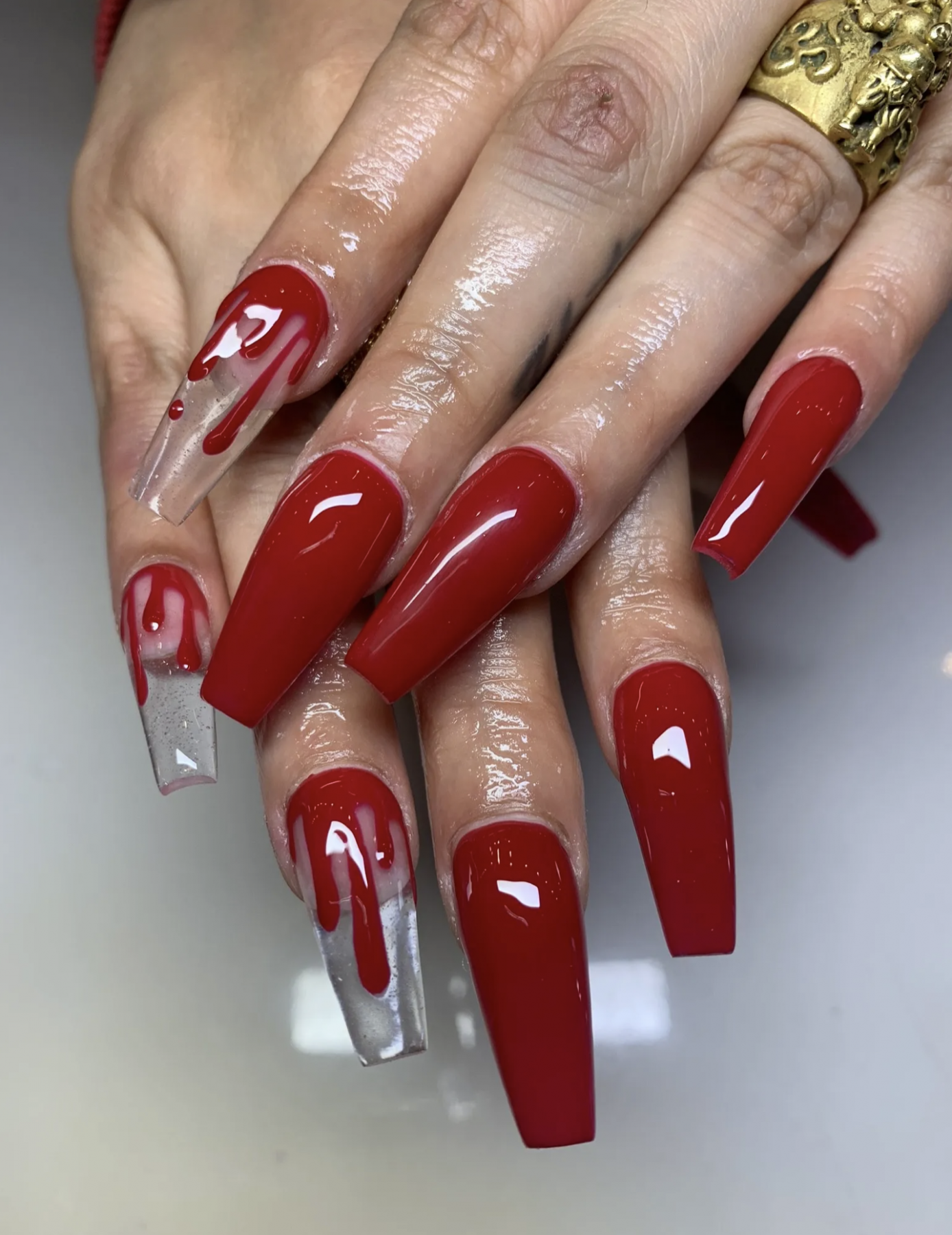 不知道從哪裡開始? 去尋找血-就是在你的指甲上。 「說到我最受歡迎的萬聖節設計,那肯定是血滴,」加州美甲師 Laysa Cazares 說道。 「我想說,我收到的前三個請求是血滴、蜘蛛網和施華洛世奇蜘蛛。黑色尖形甲肯定也適合萬聖節,但隨著方形變得超級流行,我有更多的客戶想要方形指甲」。