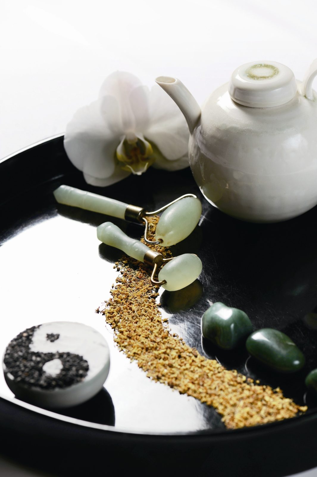 按摩以開啟全身的經絡能量線;進行中式按摩,刺激身體各處的穴位,從而達至平衡體內的陰陽能量及減壓作用。美容師會利用清涼的玉石滾輪進行面部按摩,收緊皮膚及補充水份,令人恢復身心平衡。