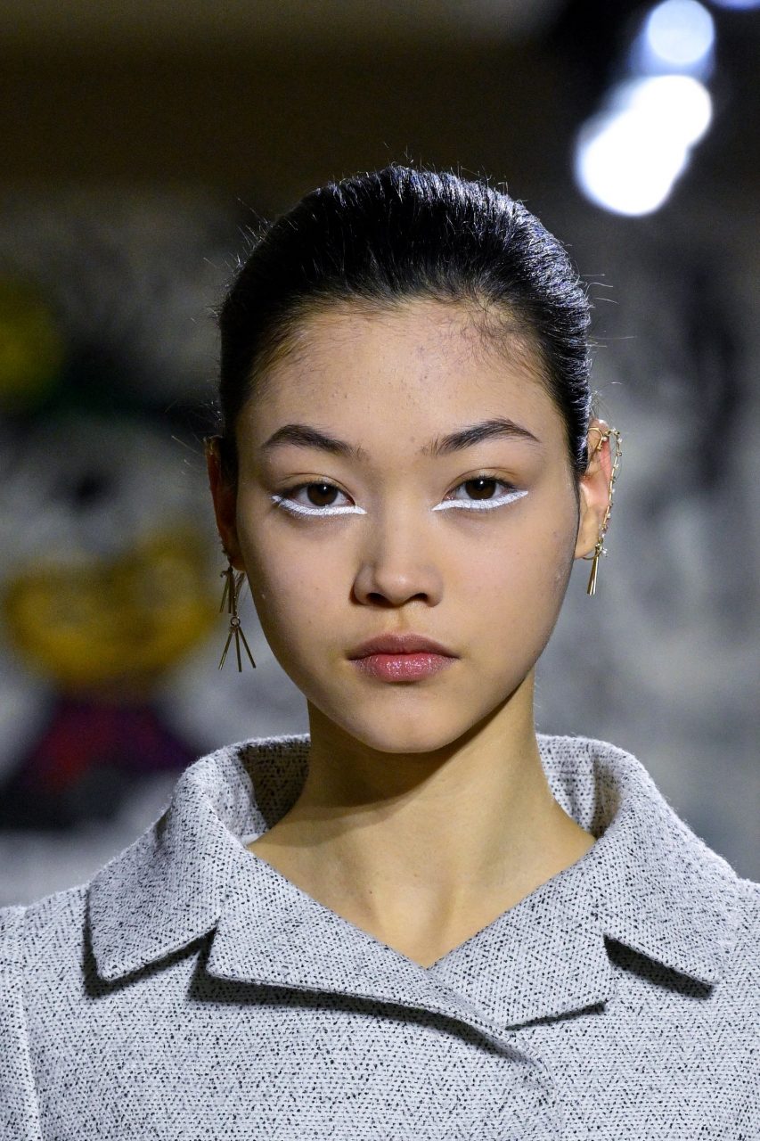 Peter Philips不喜歡黑色眼線,反而喜歡白色的啞光版本。「這種極簡主義的顏色,與該系列的色調相匹配,是純粹和優雅的,它能打開你的眼睛」,這位化妝師在後台解釋道。他沒有在上眼皮上做點綴,而是把它放在 “underliner”,也就是說放在上眼皮的下面。Peter Philips告訴我們:「以這種方式佩戴,眼線帶來了一個令人驚訝的轉折」。