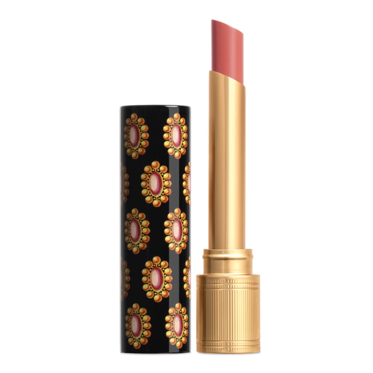 Gucci 唇膏向來受歡迎,全新推出 Rouge De Beauté Brillant 的混合型唇膏,何謂混合型唇膏?即是如唇膏般顯色又具滋潤效果的唇膏,擁有唇膏和潤唇膏的功能。唇膏共18色調,由鮮紅、粉紅、橙調充滿夏日氣氛,同時加入黑玫瑰油、牡丹花油、荷荷巴籽油和乳木果油,打造水潤效果。黑色唇膏管配上金色古董胸針圖案,配合品牌的時尚感。
