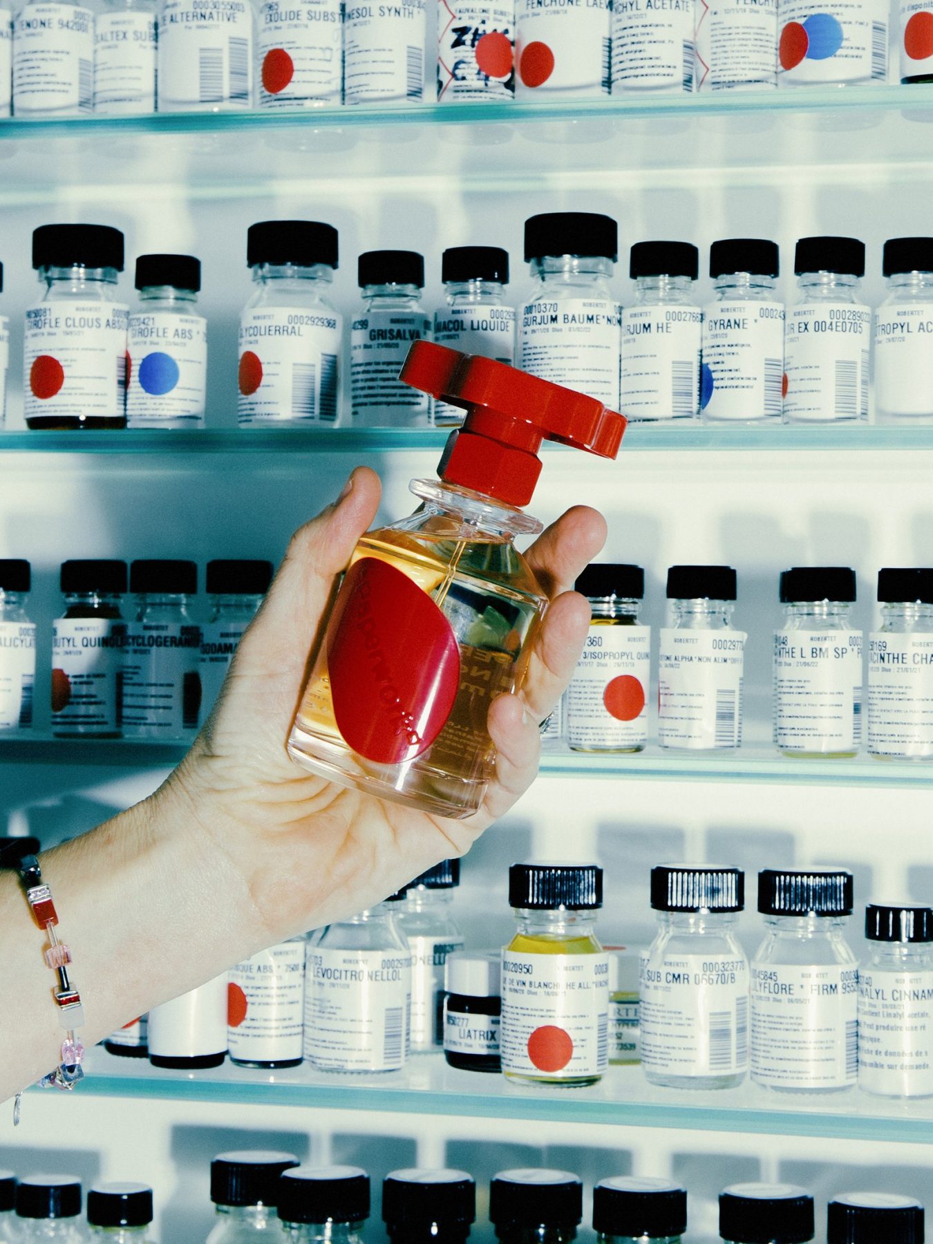 由於強調形式和功能,這對有工程和建築背景的Abloh來說極為重要,產品系列旨在實現功利性,打破我們對化妝品和香水的預期概念。 例如,顏料棒的柔軟觸感和啞光大理石色包裝,具有棱角,更方便地控制使用。隱去香水的名字是有意為之的,以確保用家在使用這些香水時不會被影響到思考或預先設定了的香氣影響。但其實每款香水都有情緒,套用於Off-White的說法是為「氛圍」,包括Solution 1的柑橘味是對九十年代運動的經典回歸,以及Solution 2是經過深思熟慮的對比成分,它混合了橘子葉、香根草、生薑和木材,產生了兩極化但令人上癮的效果。它們厚重的瓶子是由意大利Bormioli公司生產的工業玻璃雕刻而成,上面有鮮紅色的控制旋鈕,是工業香水設施中關閉桶子把手的複製品。