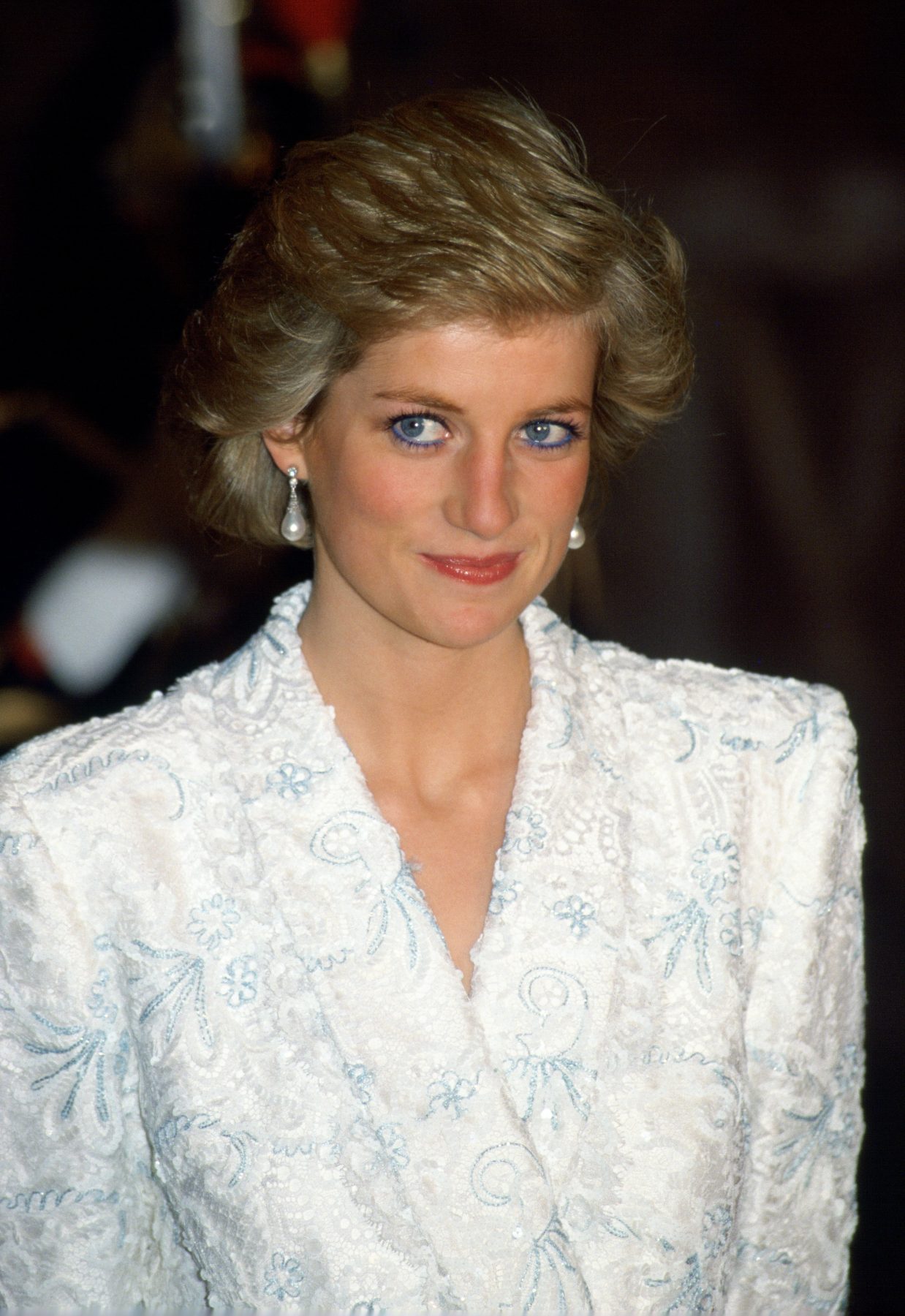 FRANCE - NOVEMBER 09: Diana, Princess Of Wales, Wearing A White And Blue Lace And Sequin Evening Coat-dress Designed By Catherine Walker For A Dinner At The Chateau De Chambord During Her Official Visit To France. (Photo by Tim Graham Photo Library via Getty Images)