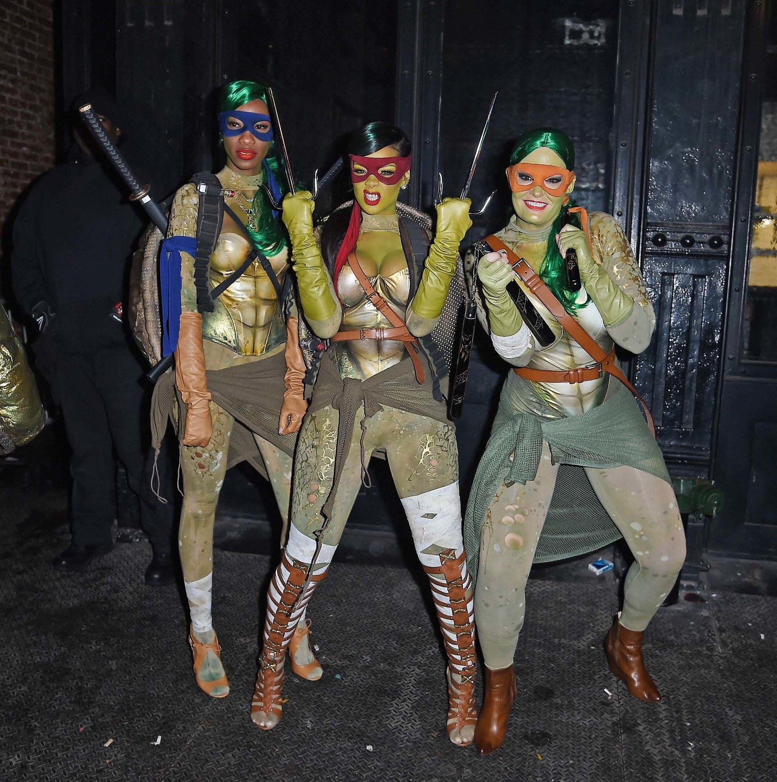 在紐約市上,百變的 Rihanna 與工作人員化身為忍者龜,畫上綠色的人體彩繪,但有趣的是,這個裝扮看起來卻意外地吸睛。而 Serena Williams則以眼鏡和馬尾,把自己裝扮成80年代的舞會皇后。