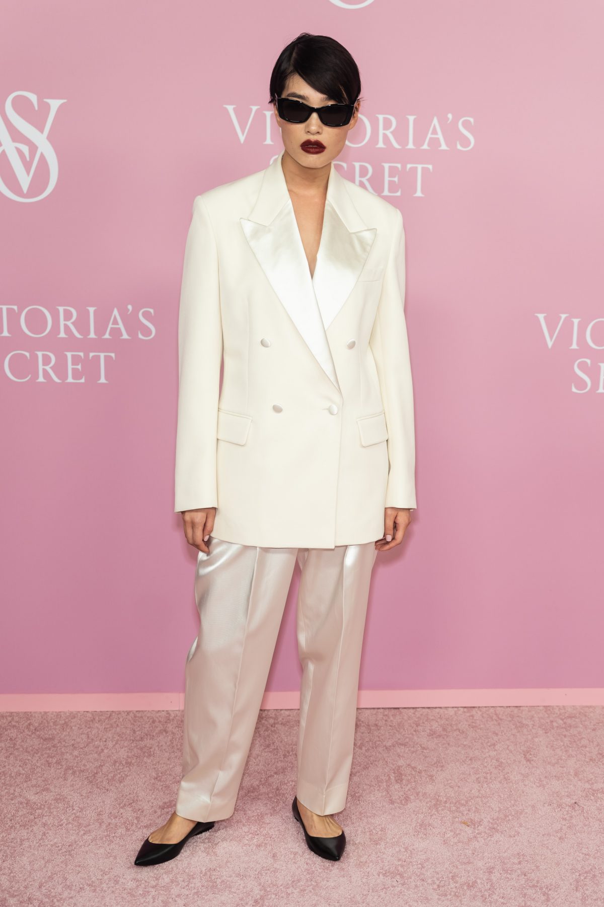 誰說Victoria’s Secret維多利亞的秘密代表性表、嫵媚?其實也可以是型格!塗上深紅唇和戴上太陽眼鏡的Sora Choi現身維密騷,而且以一身全白西裝造型來突出唇色,加以全黑短髮增添型格感。