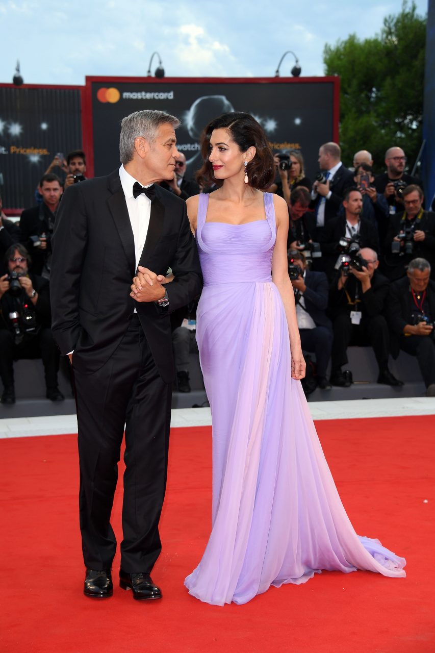 在威尼斯影展上,Amal Clooney 和 George Clooney 在生下雙胞胎後首次公開亮相。Amal Clooney 穿了一件 Versace 淡紫色禮服。