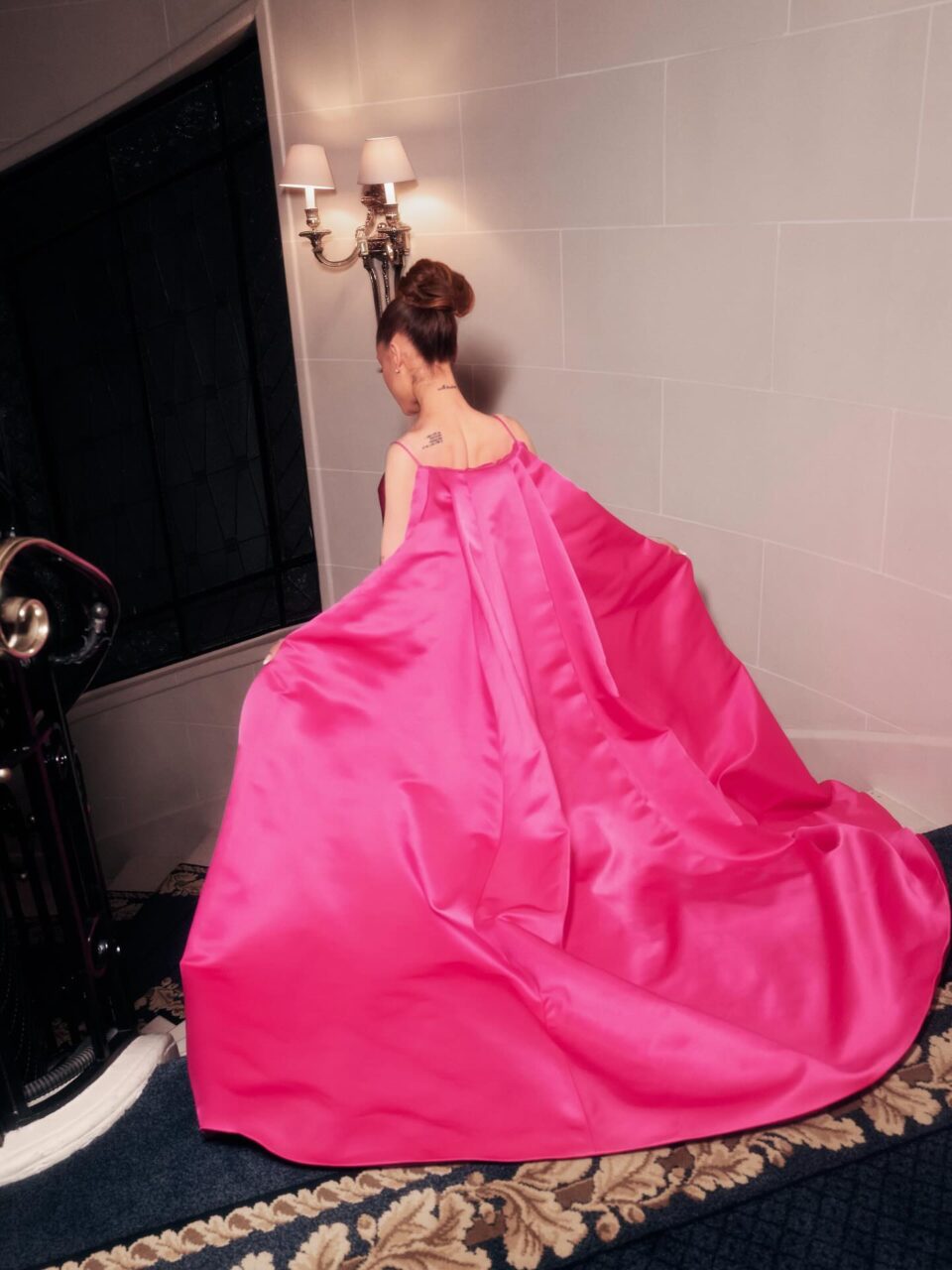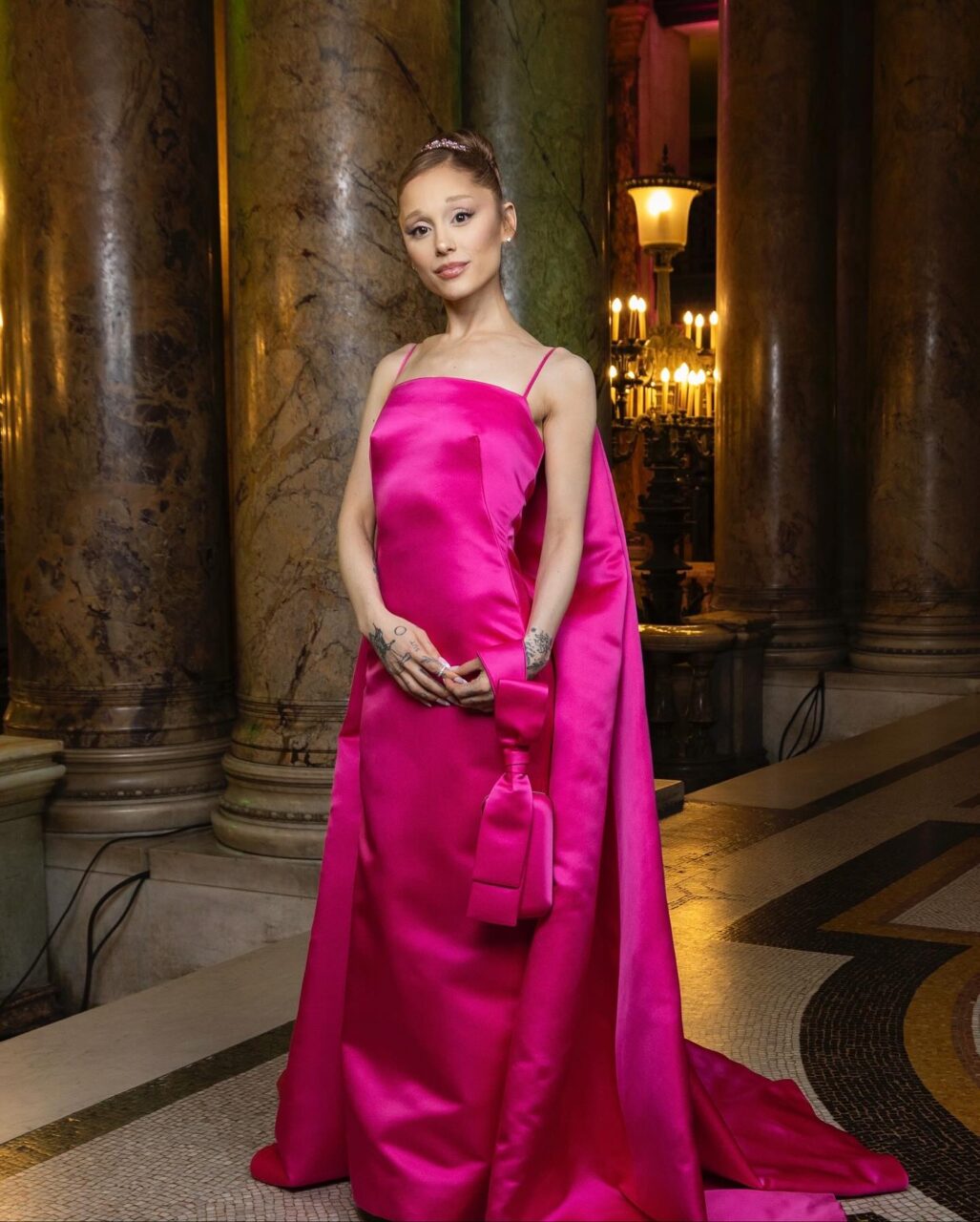 為了讓目光更集中在服裝上,Ariana在美容造型上選擇了低調的裸色系,如玻璃裸色唇膏和古銅色的胭脂,沒有使用過多色彩。整體造型完美融合了夢幻與現代感,宛如她在劇中飾演的「Glinda」一角,帶來了優雅而迷人的氣質。