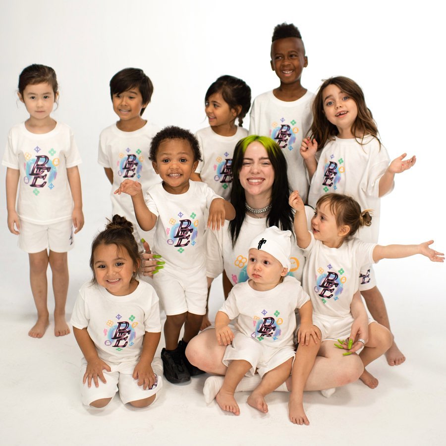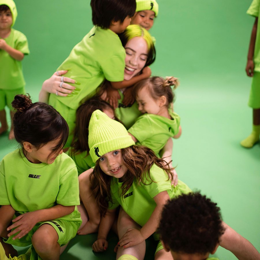 在她釋出的童裝系列廣告花絮中,看著頭染螢光綠的Billie被一群穿著自家品牌螢光綠服飾的小朋友簇擁著,group hug實在是太可愛!