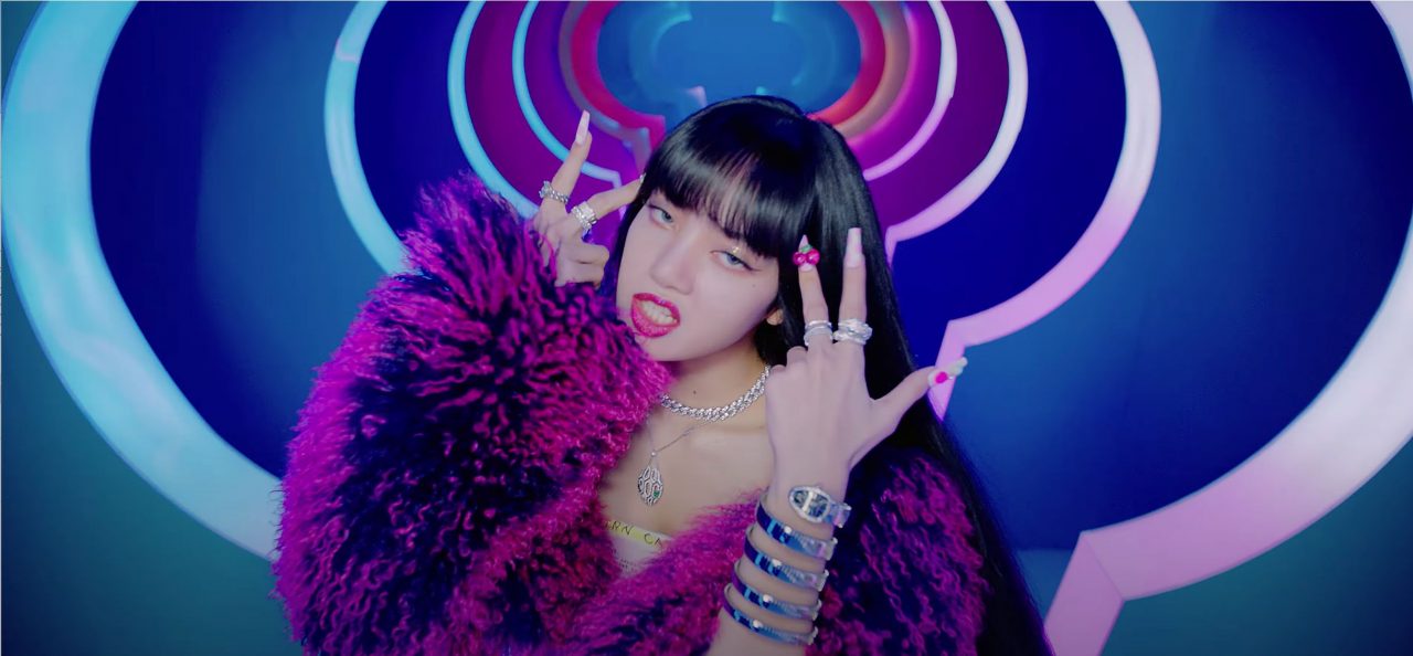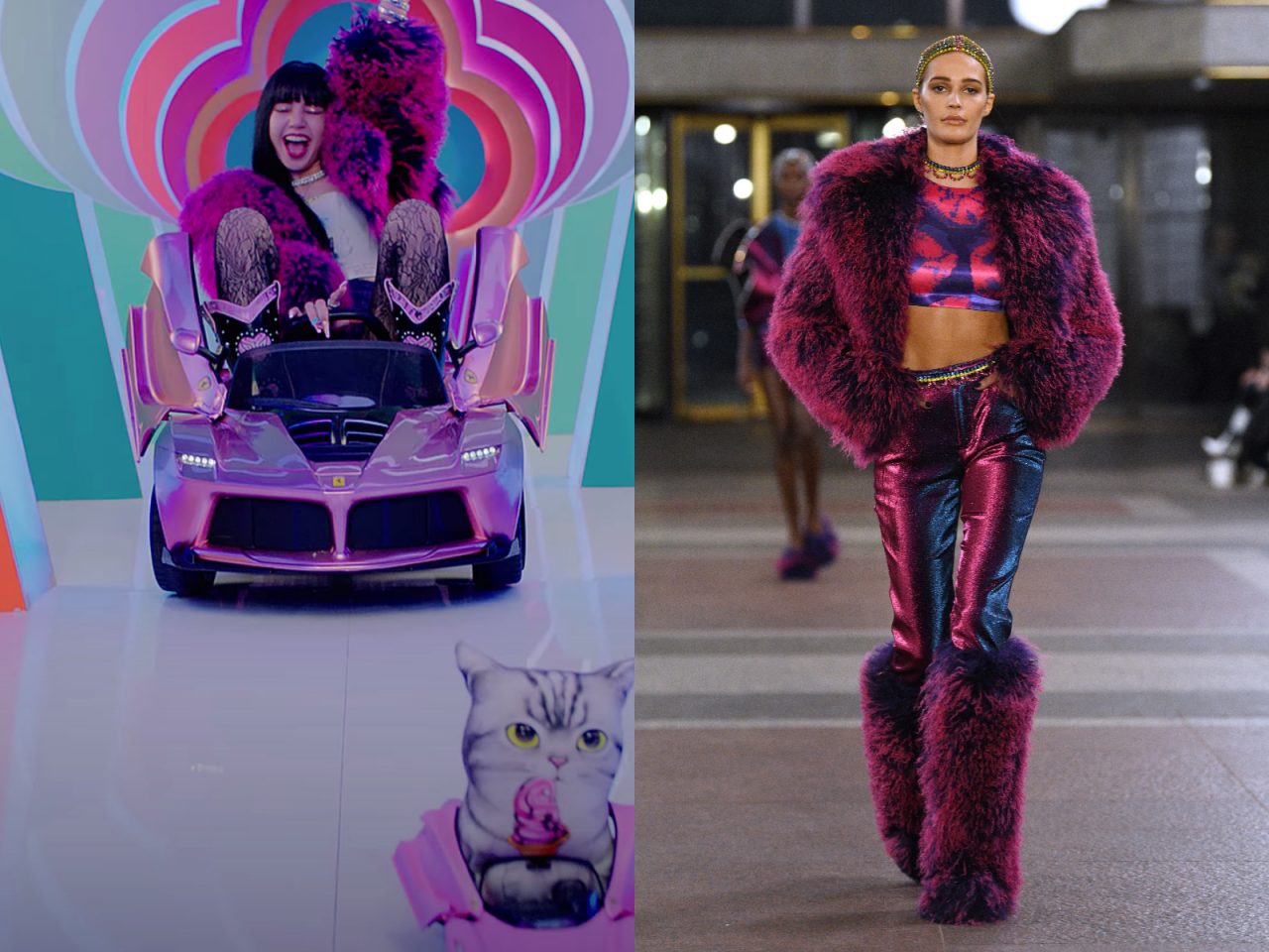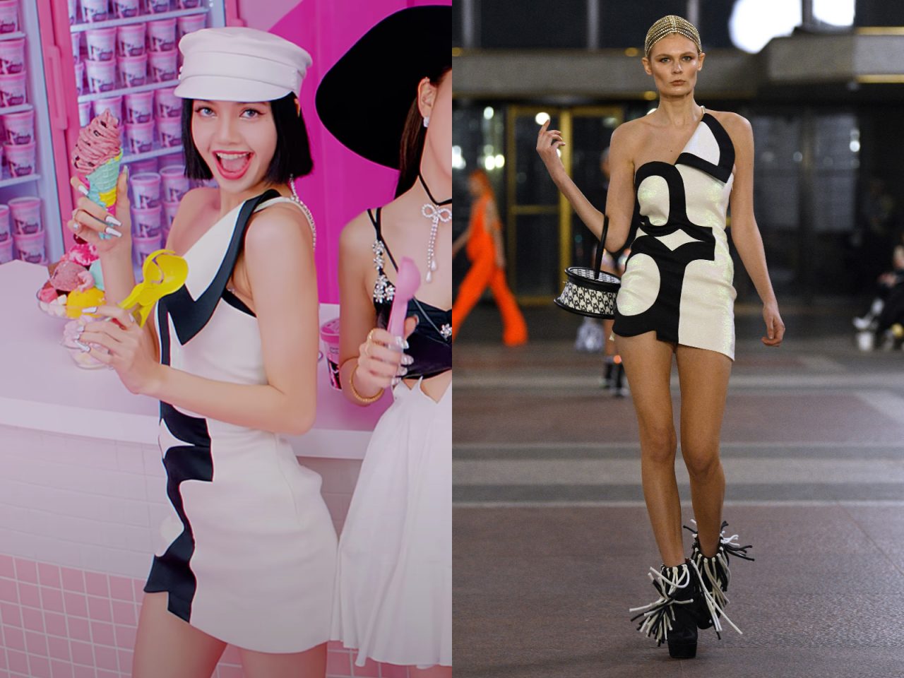 Lisa作為rapper和舞蹈擔當,每次出場的造型和氣場都十分有爆發力。她自《How You Like That》後再次穿上厚重的皮草,來自美國新晉品牌Area的2019秋冬系列。她的黑白造型中的連身裙同樣來自Area。