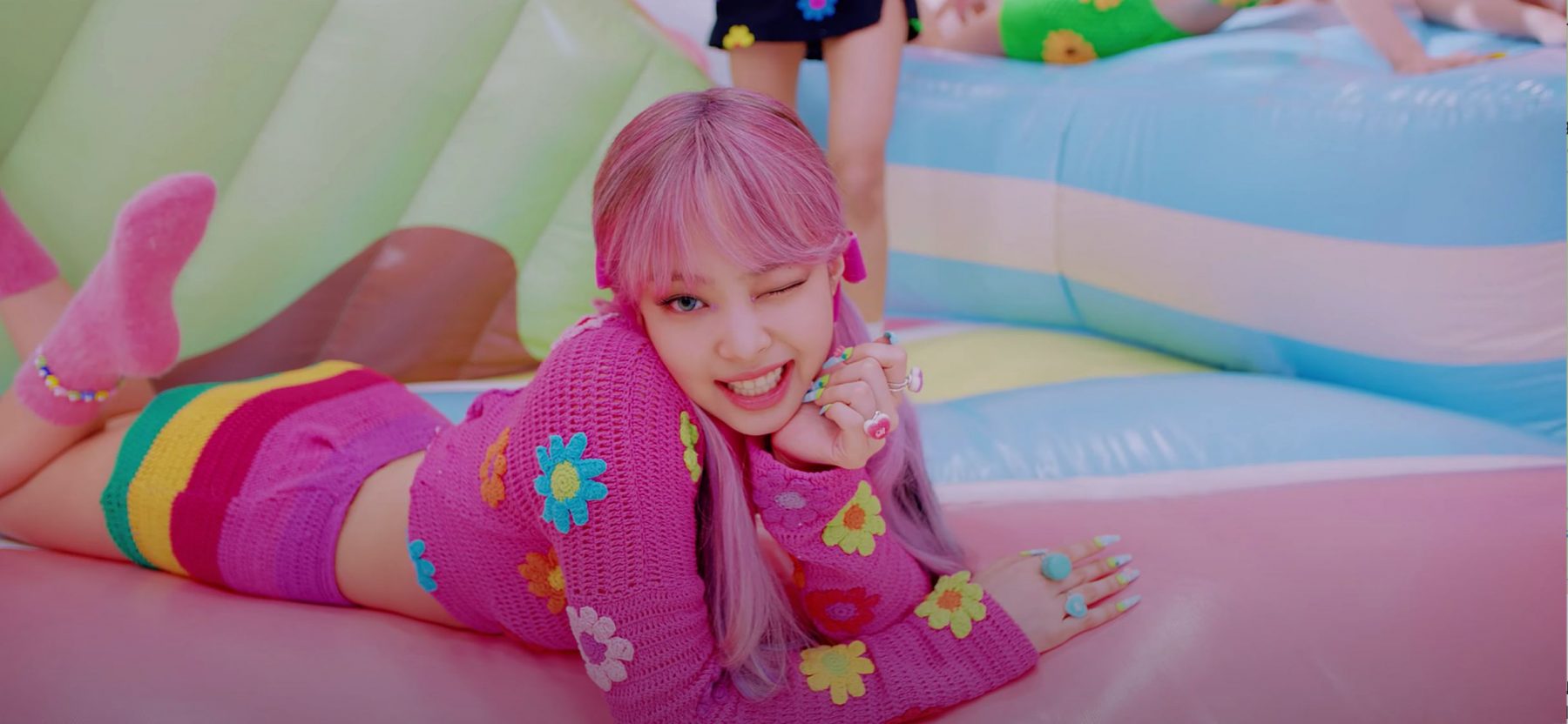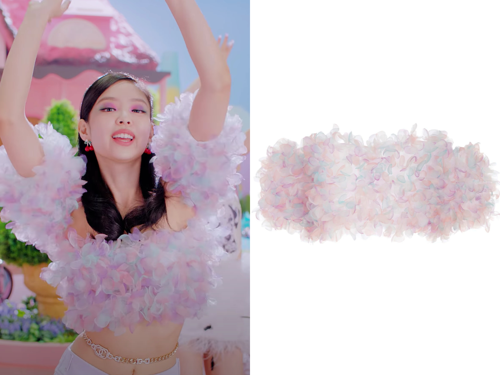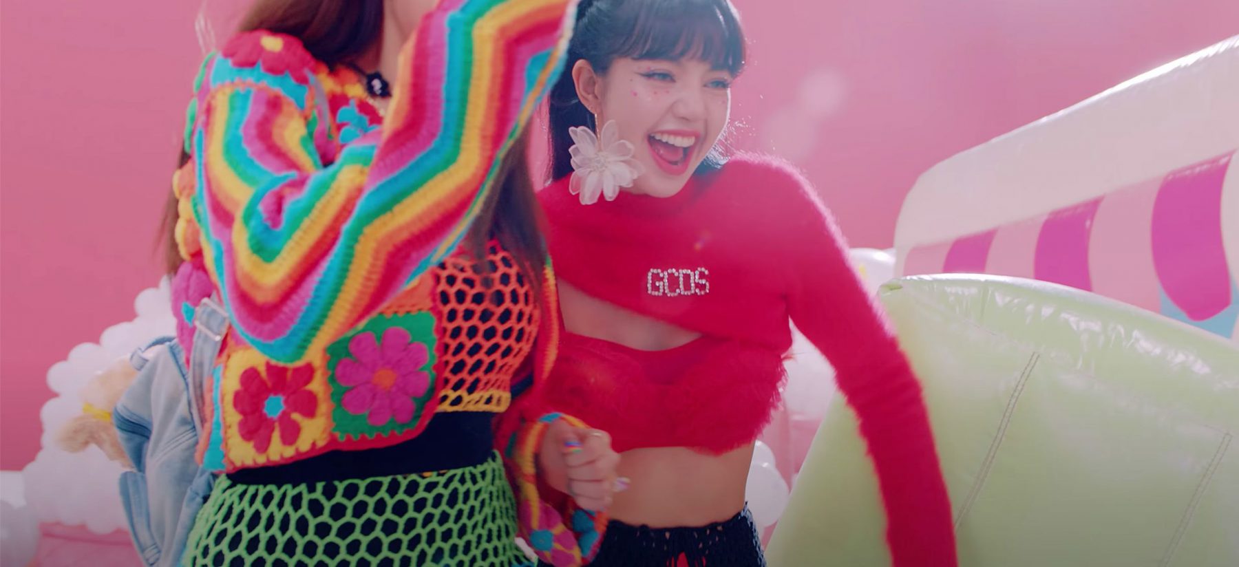 整個MV的最後一套造型可以說是在遊樂園的色彩大爆炸,Jennie、Lisa、Rose和Jisoo的花花服飾全部來自針織品牌Fluffy。