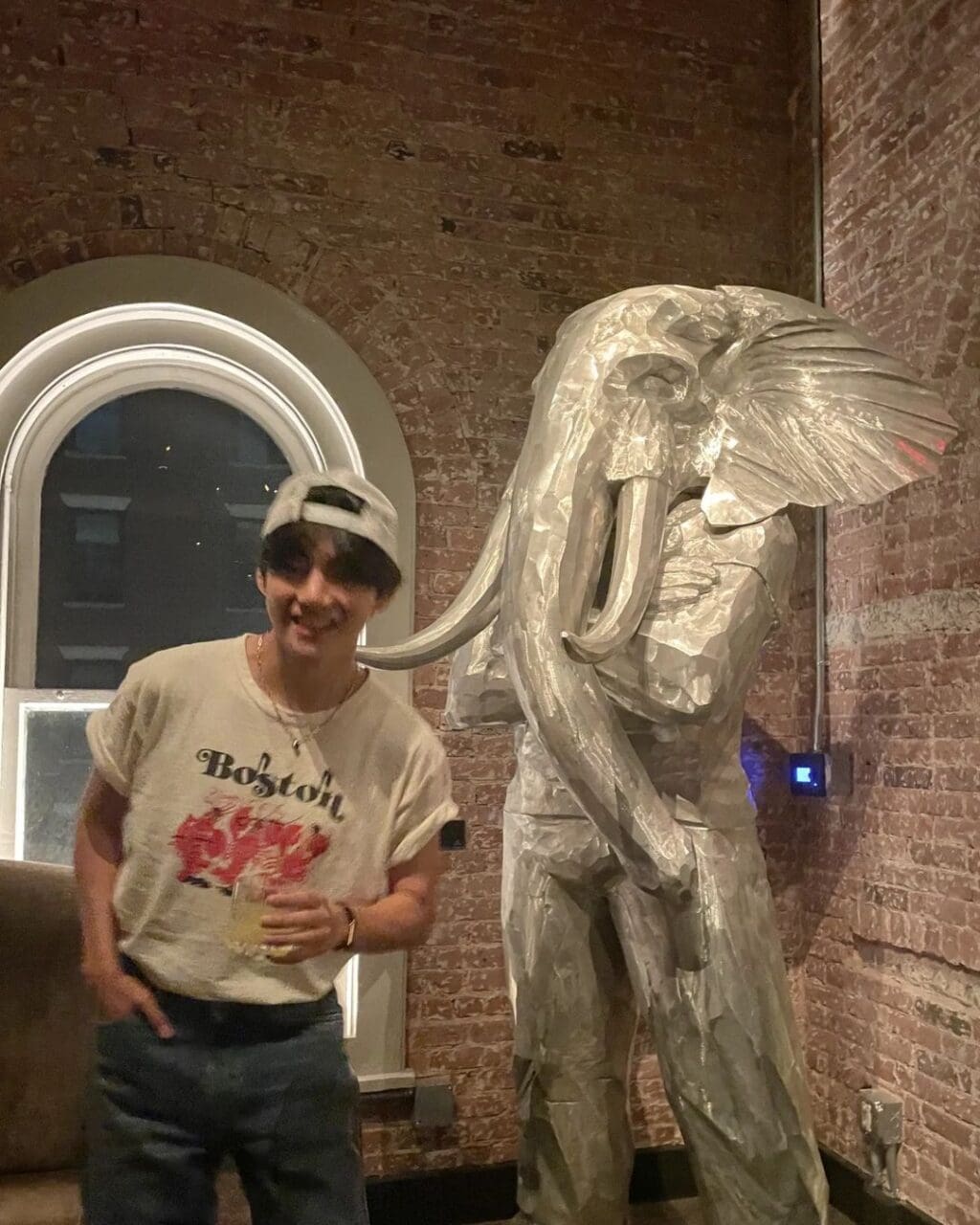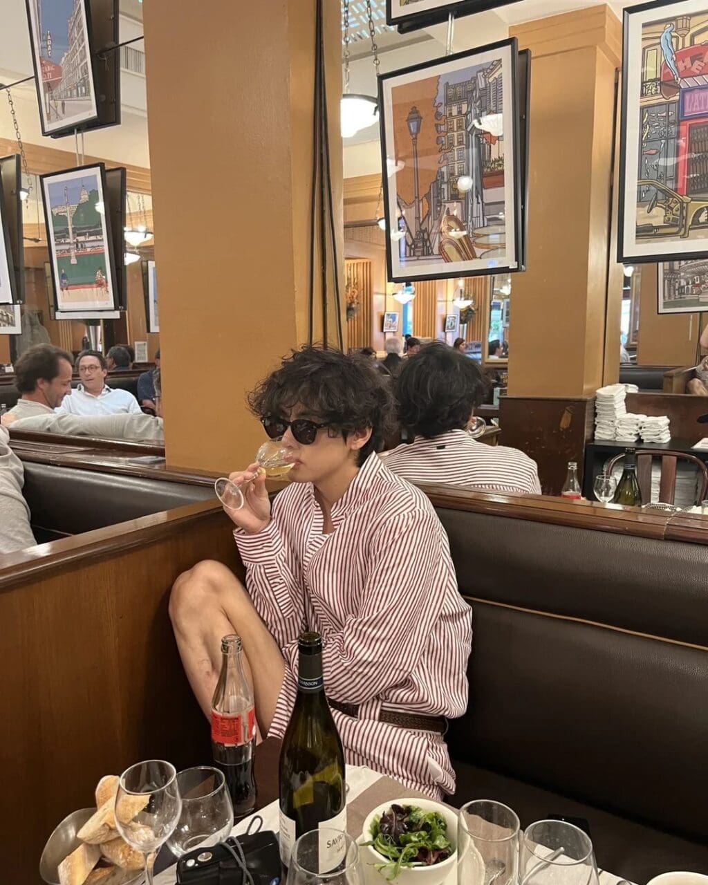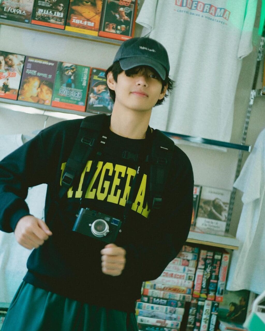出國旅行時,V也有展示不同服裝搭配。他在紐約的時候穿搭偏向減齡,基本款T恤牛仔褲加頂白色cap帽,就像個大男孩;在巴黎的時候他就穿出了截然不同的風格,白色T恤打底,外面穿上西裝外套和吊腳褲,配一雙文青系皮鞋,外套上的灰透著一點橄欖綠色,加上一頭黑捲髮,看上去更可愛又浪漫。不只是這兩套,他有時也會穿的俏皮一些,例如用oversize紅白恤衫為穿搭主角,恤衫覆蓋過短褲,就像男生版的「下衣失蹤」穿搭法,配一條咖啡色皮帶凸顯腰線,最後戴上太陽眼鏡十分型格。
