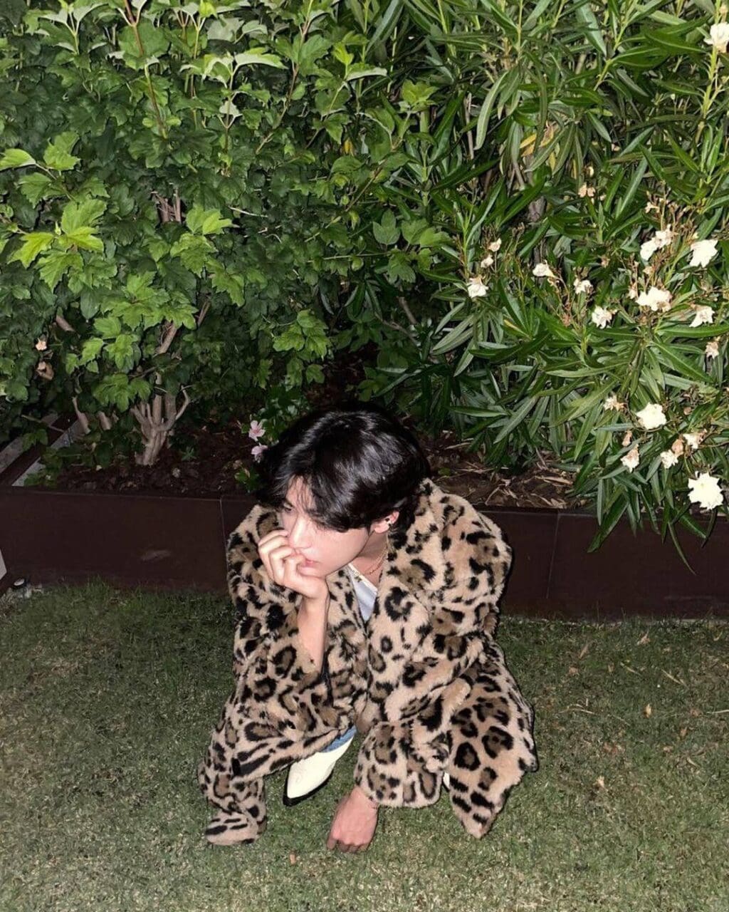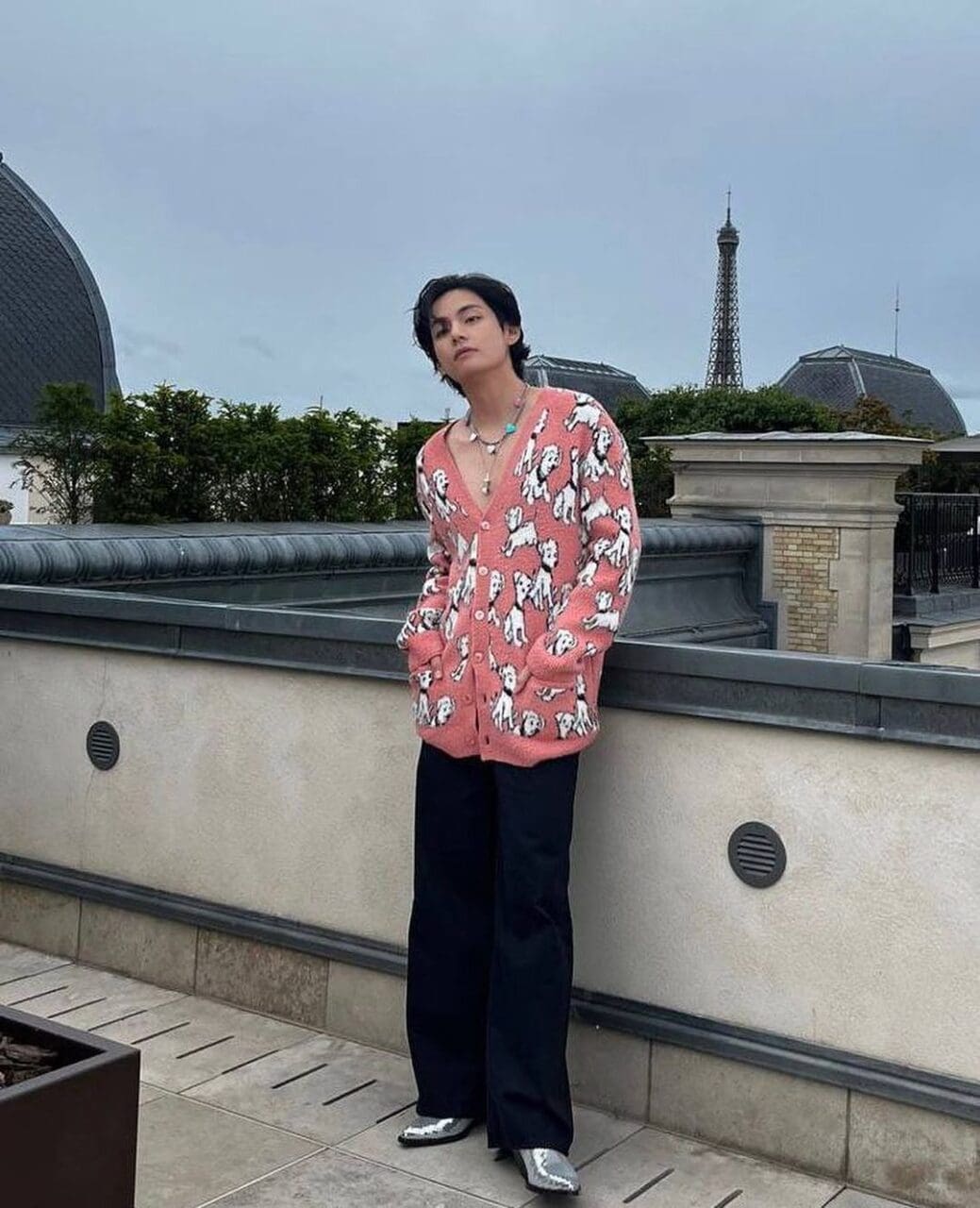 配飾方面,V也會在穿搭上玩點花樣。動物紋向來都是時尚愛好者的穿搭元素之一,V在他的黑色穿搭中繫上一條非常醒目的豹紋領巾,增添個性和時尚感。同時豹紋充滿活力,為簡約的服裝增添一抹亮點。不論當天你只是想輕輕鬆鬆落樓下繞個圈,還是外出工作甚至出席重要場合,豹紋領巾都能夠瞬間提升整體造型的層次感和時尚度。如果各位男士不怕浮誇,也可以嘗試動物紋路大衣,更顯霸氣。另一款花紋單品,是深粉紅色的毛衣,上面印有白色小狗圖案,簡單配一條黑褲就完成了中性的可愛穿搭。