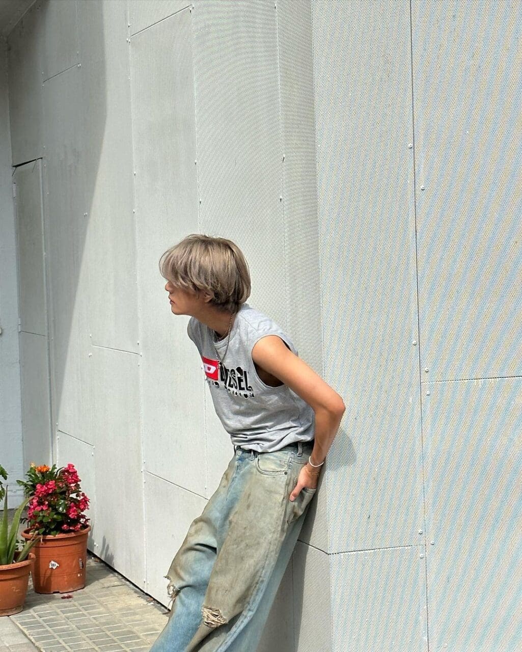 不論是拍MV還是日常外出,V的穿搭都以舒適為主,例如這套街頭風穿搭,灰色無袖背心搭配做舊洗水牛仔褲,輕鬆隨意。無袖設計簡約大方,為整體造型增添了一絲幹練,也適合各種場合,例如出外活動或約朋友。舊款洗水牛仔褲則帶有復古的味道,淺藍色和做舊效果使得整體造型更具層次感。這樣的搭配清爽又透氣,非常適合夏季。普通外出的話可以搭配一雙運動鞋或涼鞋,想正式一點又可以選擇一雙簡約的平底鞋或靴子。如果當作入秋穿搭,也可以像V那樣搭一件灰色拉鍊外套,十分簡約。