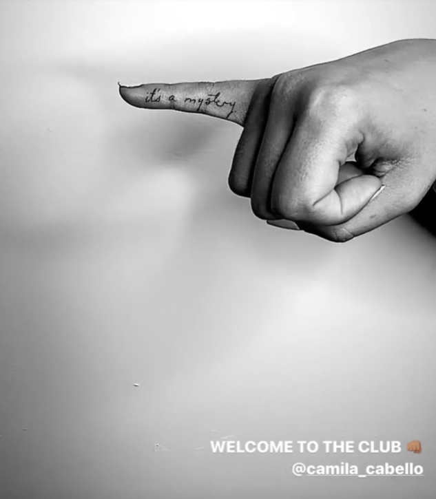 紋身對於一些人來說,往往是帶著不同的意義。而在 2017 年的電台訪問上,Camila Cabello 曾說過自己可能不會紋身,因為她認為自己的人生會經歷不同階段,很多事情都會改變。這樣看來,Camila 終究還是敵不過這段甜蜜的愛情。她的首個紋身在小拇指側邊,是出自《莎翁情史》(Shakespeare in Love)的台詞:「it’s a mystery。」而 Shawn Mendes 則是紋了一個「A」在他的耳朵後,相信是代表了他的16歲妹妹 Aaliyah Mendes。