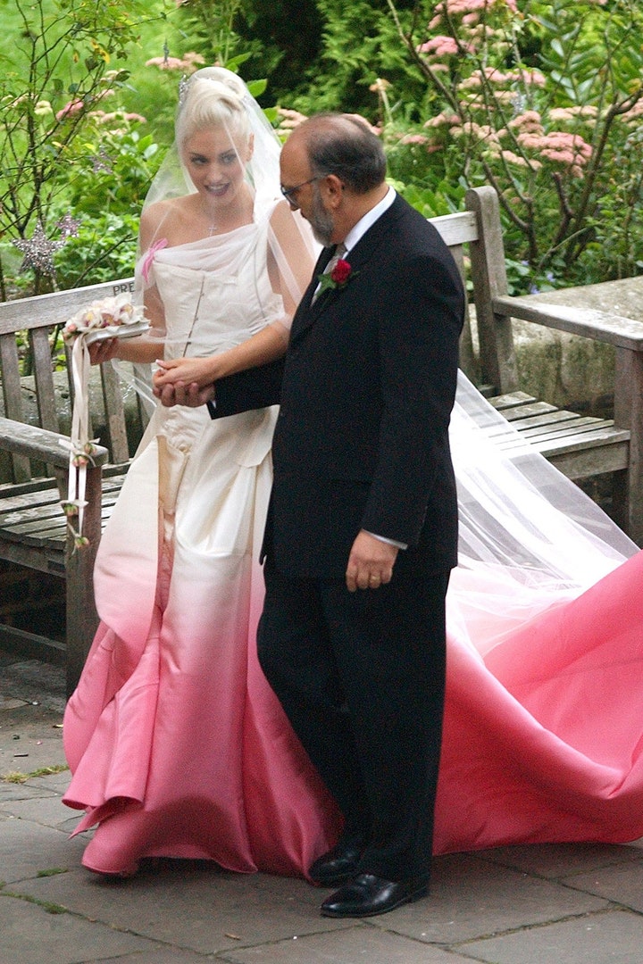 Gwen Stefani 是眾多明星穿上彩色婚紗的最著名代表之一,於2002年她穿上裙擺有粉色浸染的 John Galliano 禮服,嫁給了她的第一任丈夫 Gavin Rossdale。