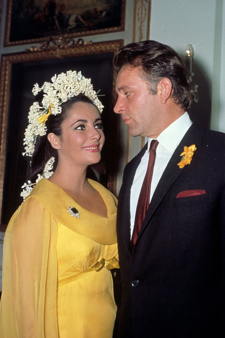 Taylor 在1964年第六次結婚,這是她與演員 Richard Burton 兩次結婚的第一次,她選擇了一條芥末黃的連身裙,上面戴著雛菊的頭飾。