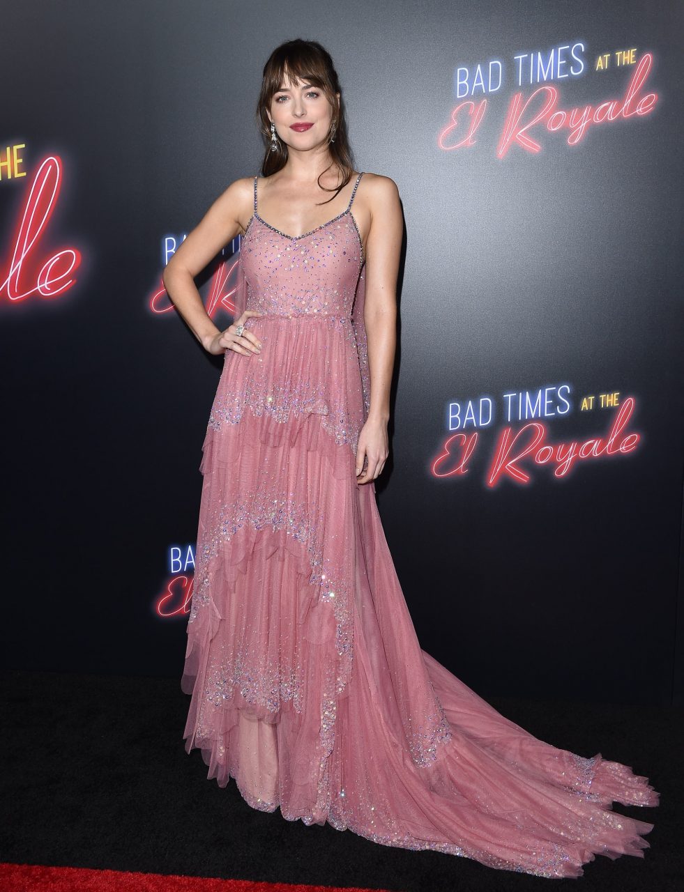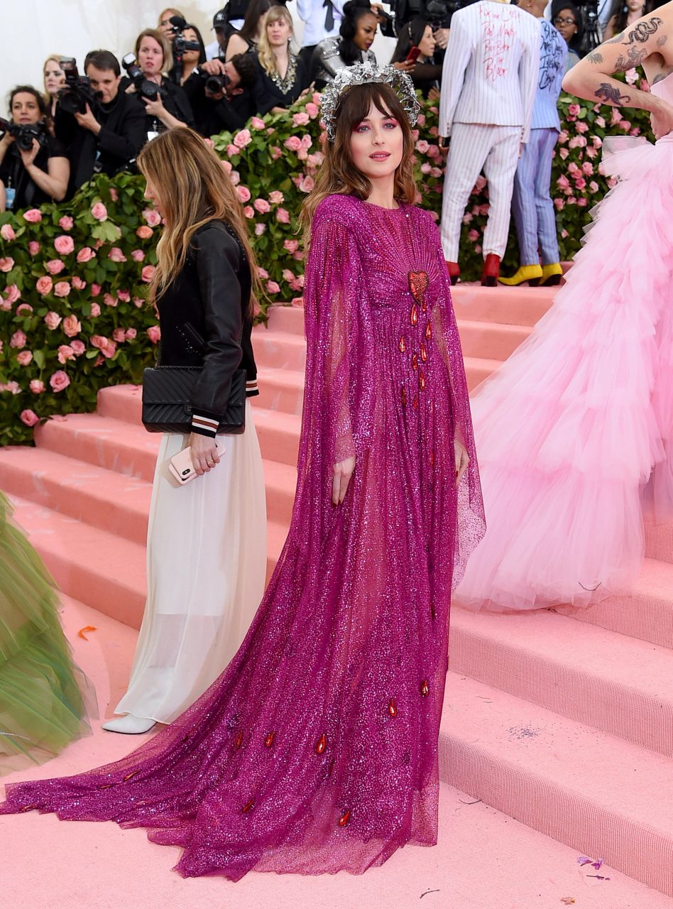 Dakota Johnson 在2019年 Met Gala 同樣以 Gucci 造型亮相。當年的主題是「Camp: Notes on Fashion」,她也應景地穿上閃亮的紫紅色長裙,胸前鑲有一顆流血的心臟頗顯別緻。