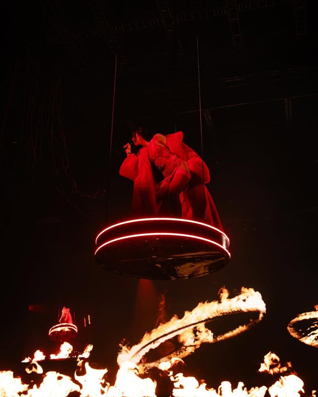 在演唱《Love Again》時,一圈火焰環繞舞台,帶來震撼的視覺效果。此時她披上紅色的Balenciaga仿真毛皮外套,搭配紅色Slip Dress,充滿野艷氣息。