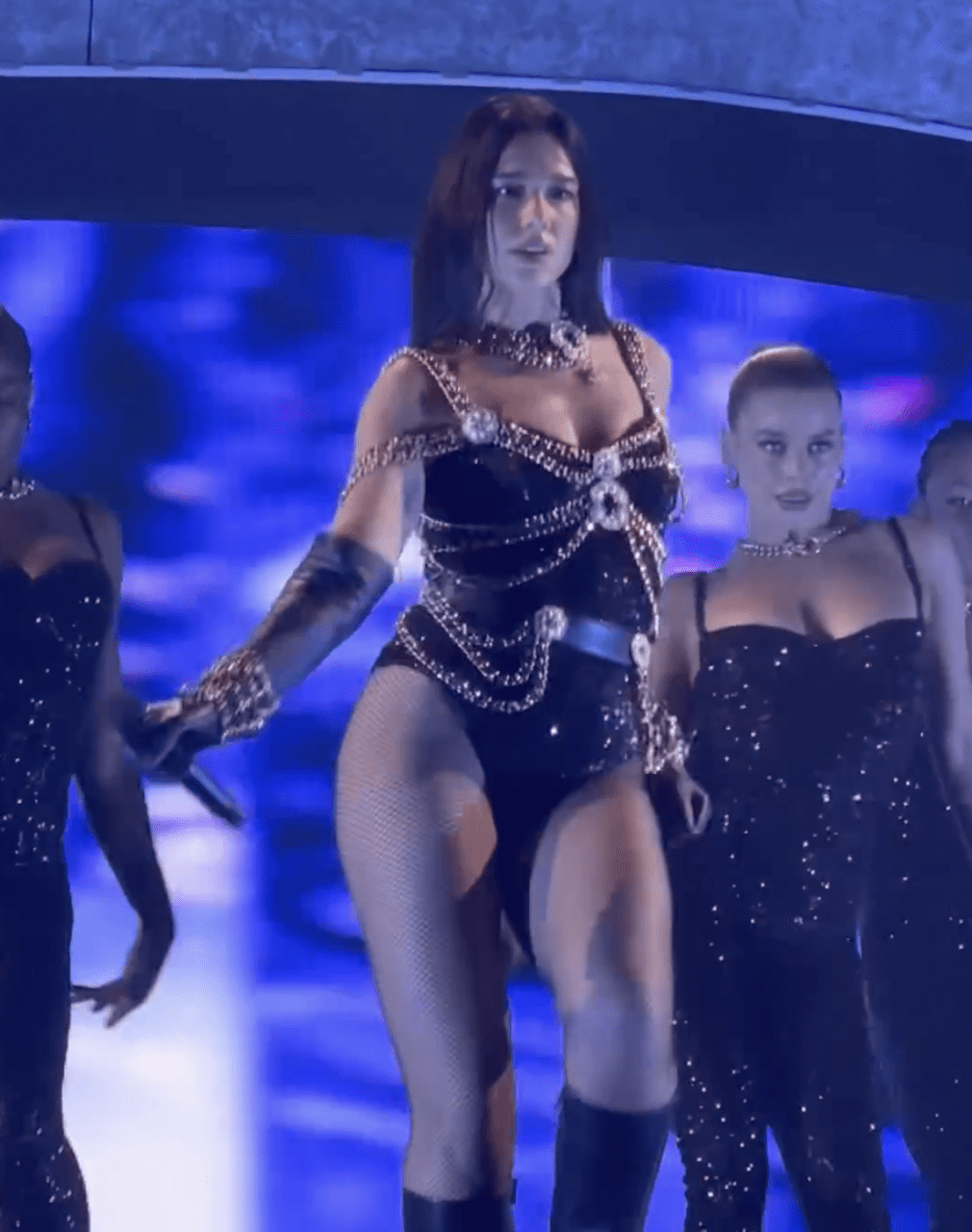 演出會揭開序幕時,Dua Lipa以一套香檳色的Bodysuit驚艷亮相,盡顯高挑身材。這件由Jean Paul Gaultier設計的服裝飾有璀璨的水晶,搭配珠寶長靴後,讓她在舞台燈光下閃閃發光,無比搶眼。