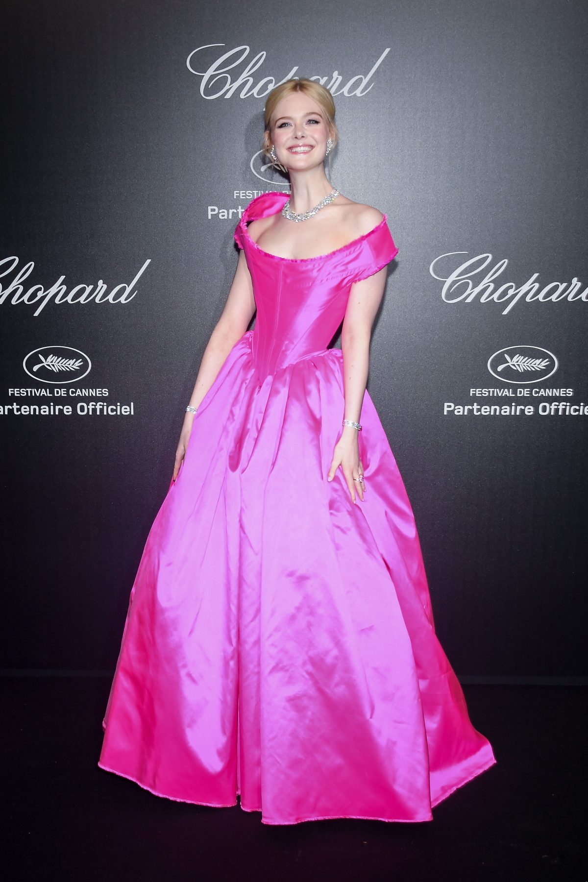 2019年5月15日,Elle Fanning 參加第72屆康城影展,《Les Miserables》首映禮;身穿 Valentino 印花禮服。