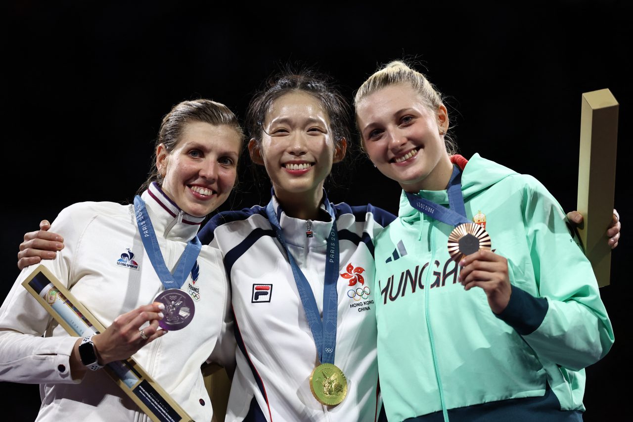 Silver medallist France's Auriane Mallo-Breton (L), gold medallist Hong Kong's Kong Man Wai Vivian and Bronze medalist Hungary's Eszter Muhari celebrate on the podium during the medal ceremony for the women's epee individual competition during the Paris 2024 Olympic Games at the Grand Palais in Paris, on July 27, 2024. (Photo by Franck FIFE / AFP) (Photo by FRANCK FIFE/AFP via Getty Images)