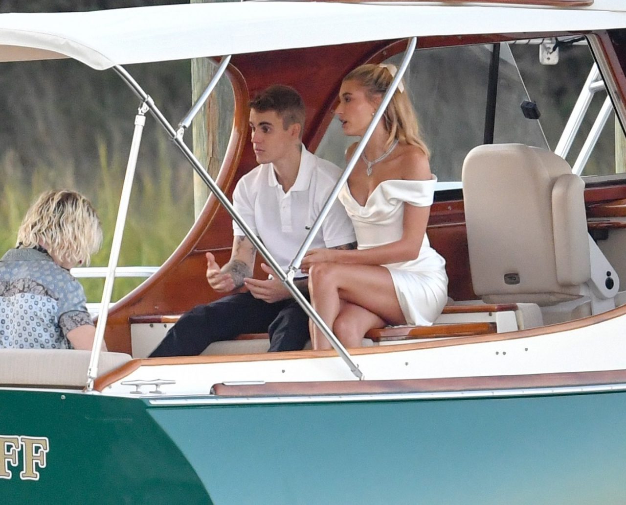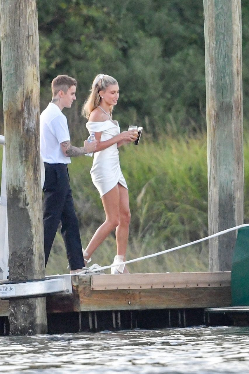 除此以外,早前 Hailey Bieber 與 Justin Bieber 夫婦帶同朋友和家人到南拉羅萊納州參加婚禮的時候,當晚婚禮派對,Hailey 便穿上由 Vivienne Westwood 所訂製的象牙白緊身連身裙,這款露肩設計的連身裙採用 “Peace Silk” 的環保物料所製成。Justin 則穿簡約的白色恤衫相襯,相當甜蜜。