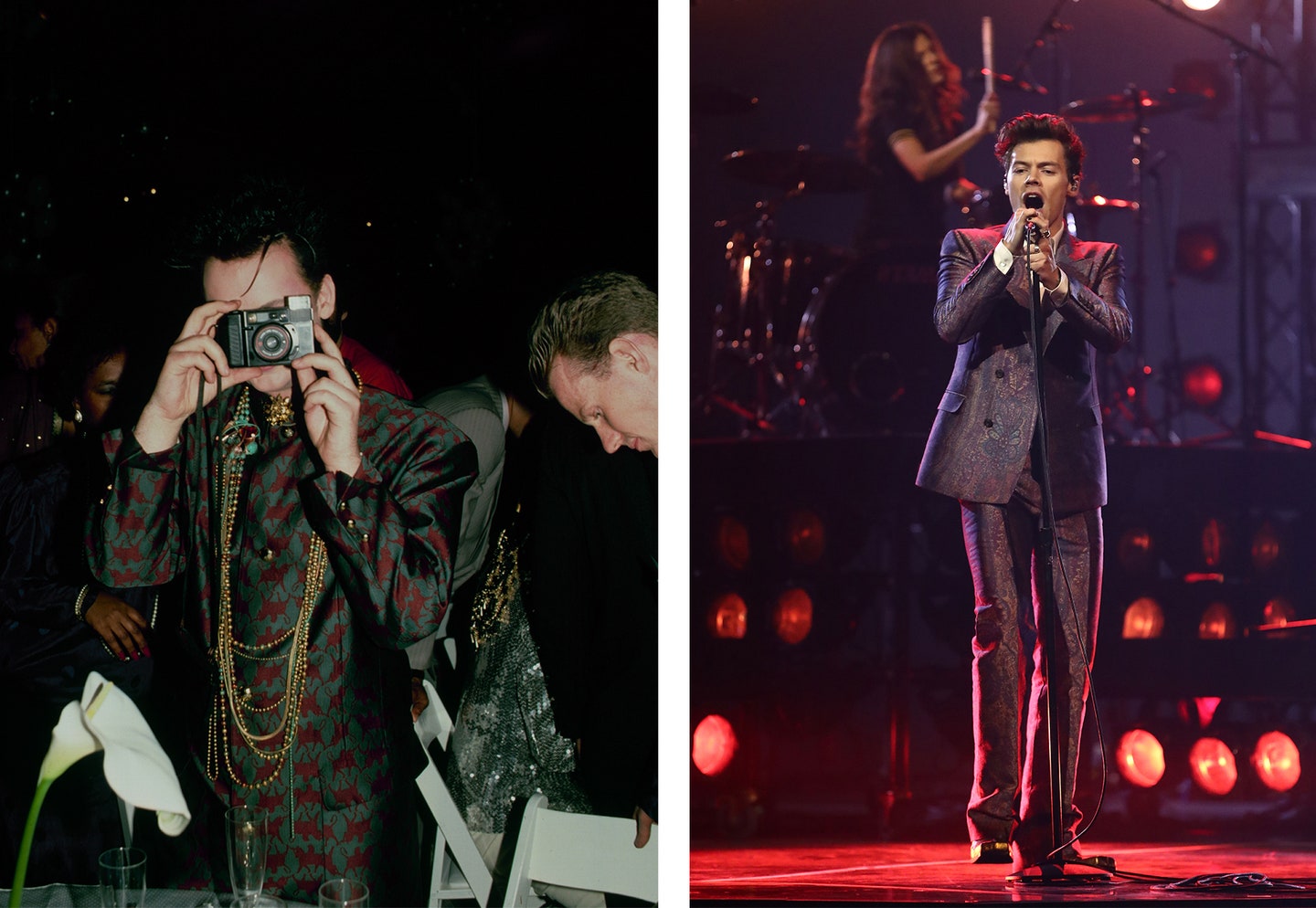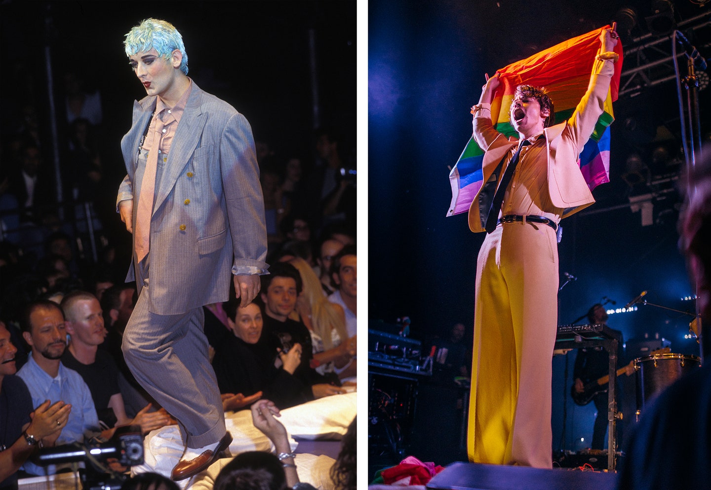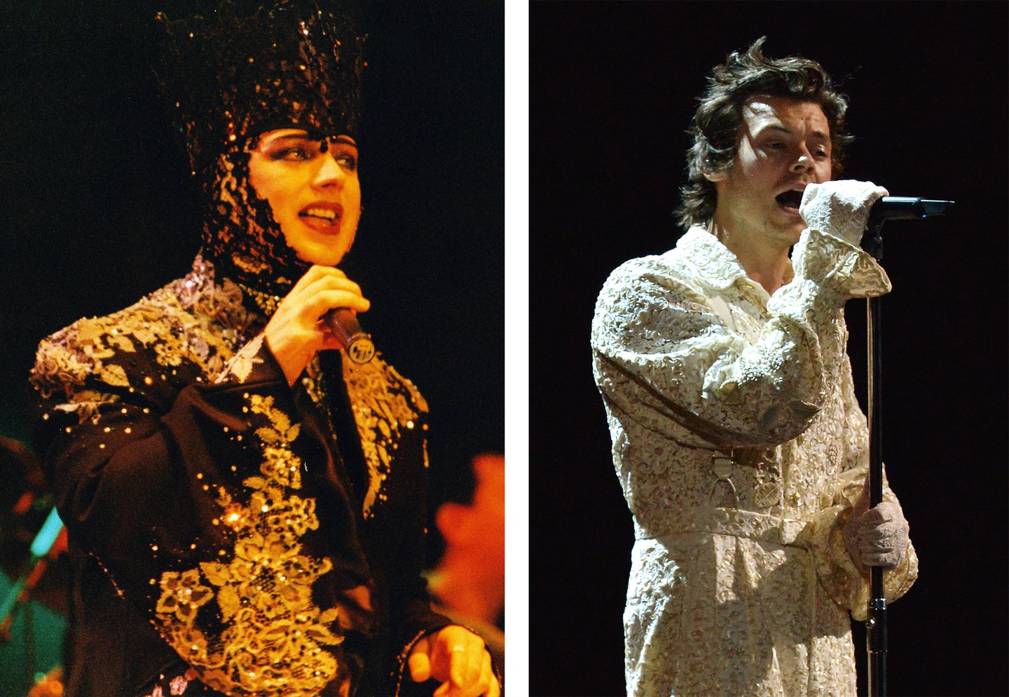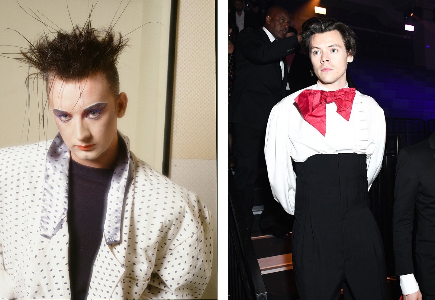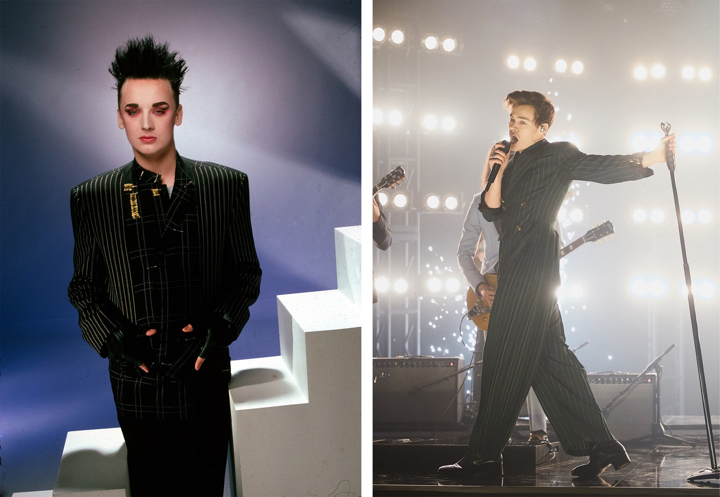 Harry Styles 穿上英國品牌 Charles Jeffrey 的連身褲已經成為他最受歡迎的造型之一,而 Boy George 早在1985年就穿過相似的細條紋西裝。