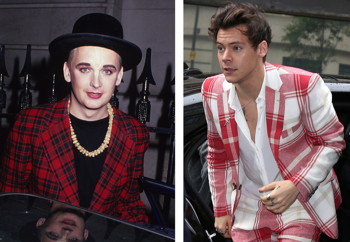 格紋西裝絕對是Boy George及Harry Styles衣櫃中恆常存在的單品。 在他們身上,格紋變成朋克風格,而非書院風。一起欣賞 Boy George 這套時尚造型搭配,以及 Harry令人難忘的Vivienne Westwood造型。