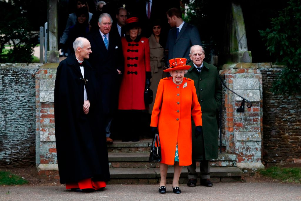 Britain's Queen Elizabeth II (C) and Britain's Prince Philip, Duke of Edinburgh (R) lead out other members of the family with Reverend Canon Jonathan Riviere (L) as they leave after attending the Royal Family's traditional Christmas Day church service at St Mary Magdalene Church in Sandringham, Norfolk, eastern England, on December 25, 2017. / AFP PHOTO / Adrian DENNIS (Photo credit should read ADRIAN DENNIS/AFP via Getty Images)
