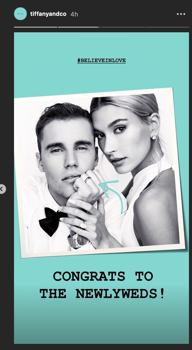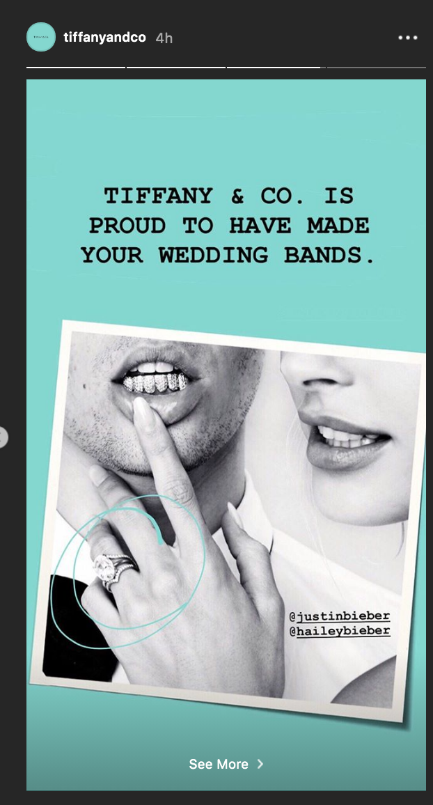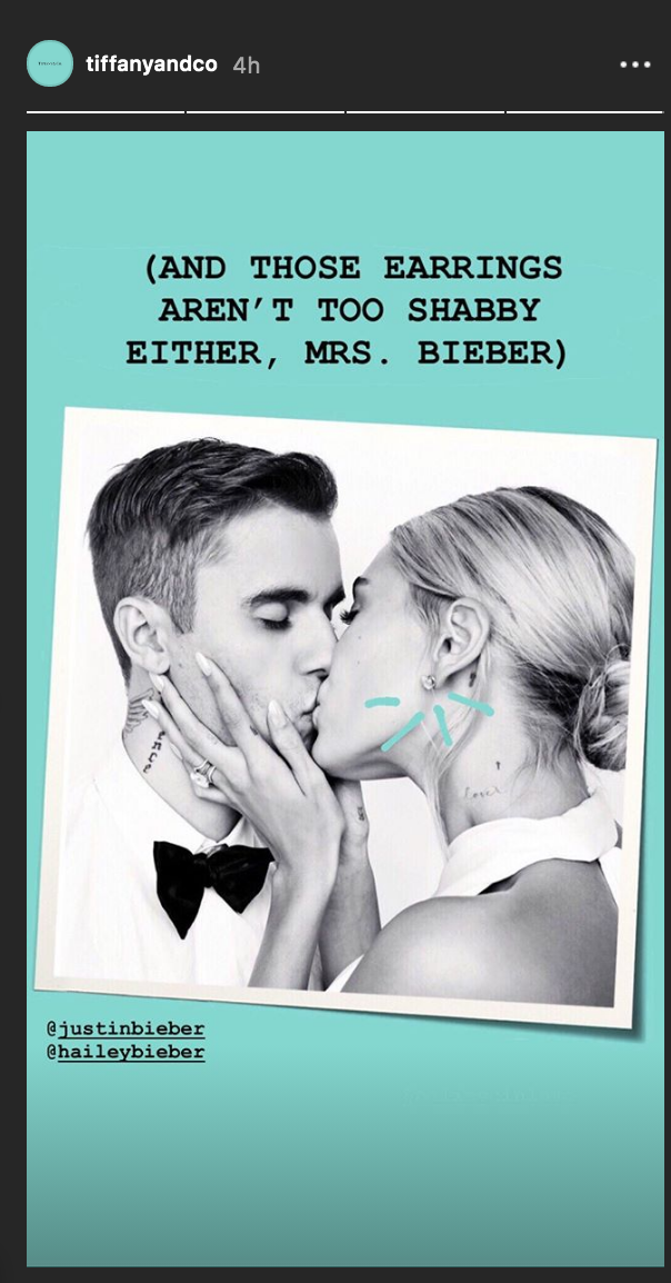 而兩人發佈的正式婚禮相片上,清晰可見的婚戒及Hailey簡單優雅盤髮旁的鑽石耳環皆出自Tiffany & Co. 。而Hailey背面寫有“Wife”的訂製皮衣,便是來自Celine的禮物。
