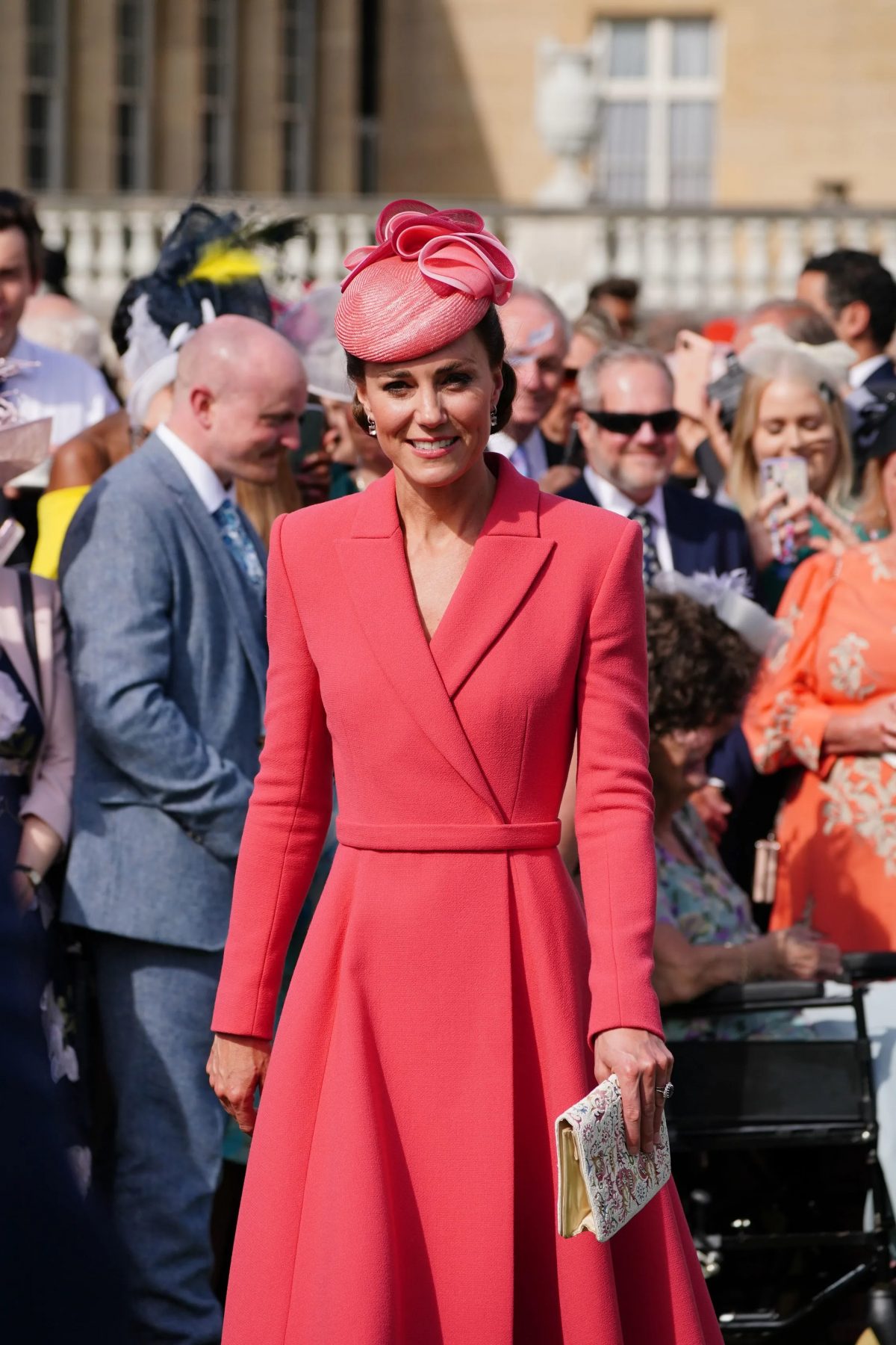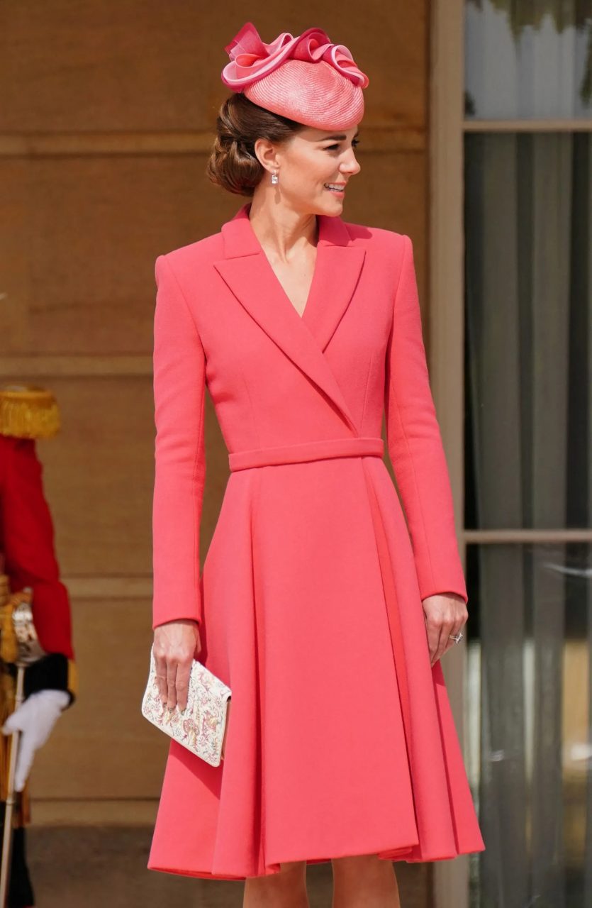 在昨天的白金漢宮花園派對上,公爵夫人將這款復古手拿包與 Emilia Wickstead 的珊瑚色外套連衣裙和 Jane Taylor 的迷人頭飾搭配在一起。她用 Emmy London 的高跟鞋和一對由她最喜歡的珠寶商之一 Kiki McDonough 設計的粉色摩根石耳環來完成這一造型。