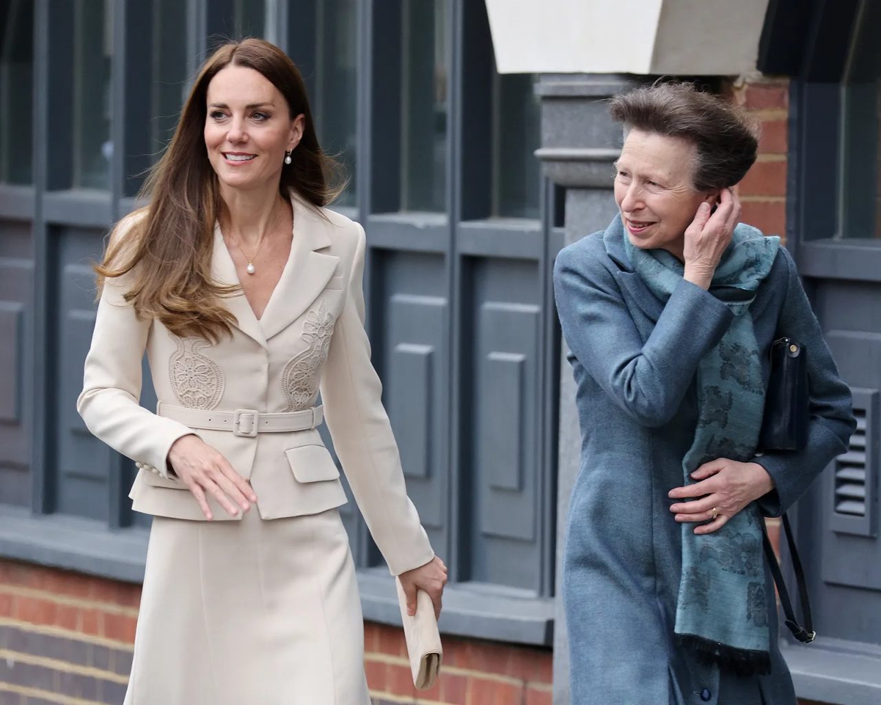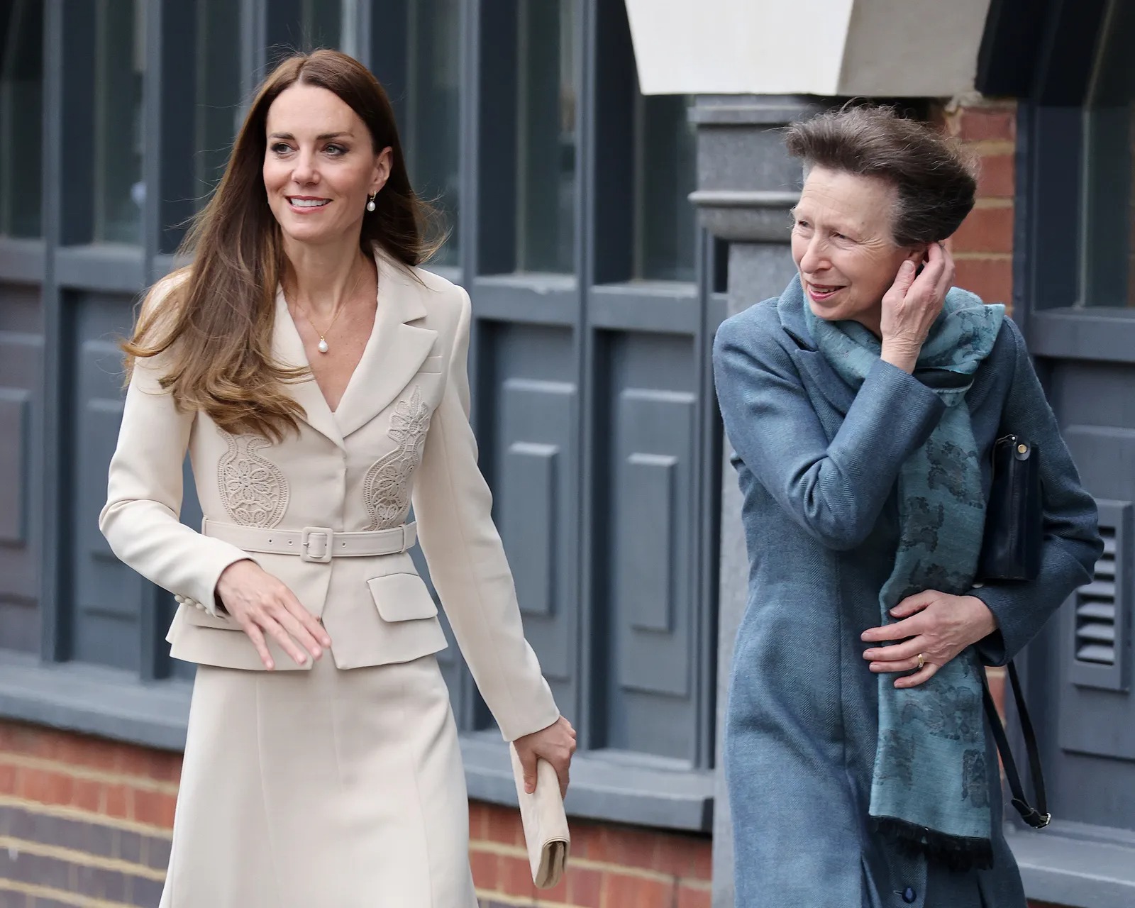另一方面,安妮公主穿著一件深綠松石綠色外套,頸上圍著一條相配的印花絲巾,一個黑色的單肩袋和黑色的小貓高跟鞋。