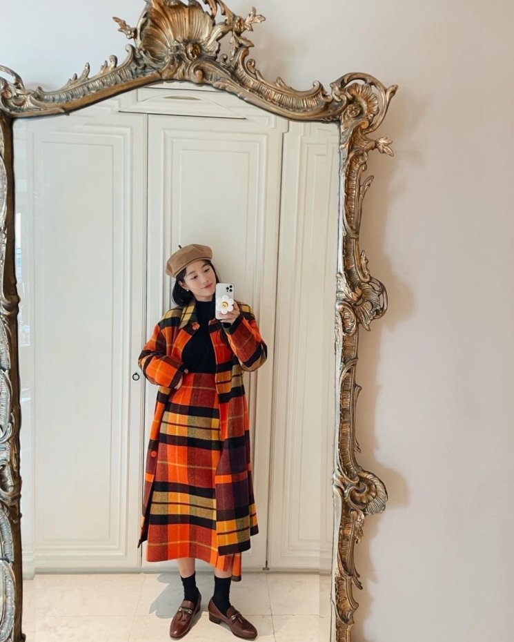 奇恩世以橙色、芥末黃、啡色、黑色等顏色的格仔外套和長裙打造出的OOTD造型,散發出濃濃的冬日氣息。 儘管外套和裙子很明豔,但內裏用一件黑色高領毛衣來平衡整個感覺。 在這裡,米色畫家帽增添了可愛的氣質。
