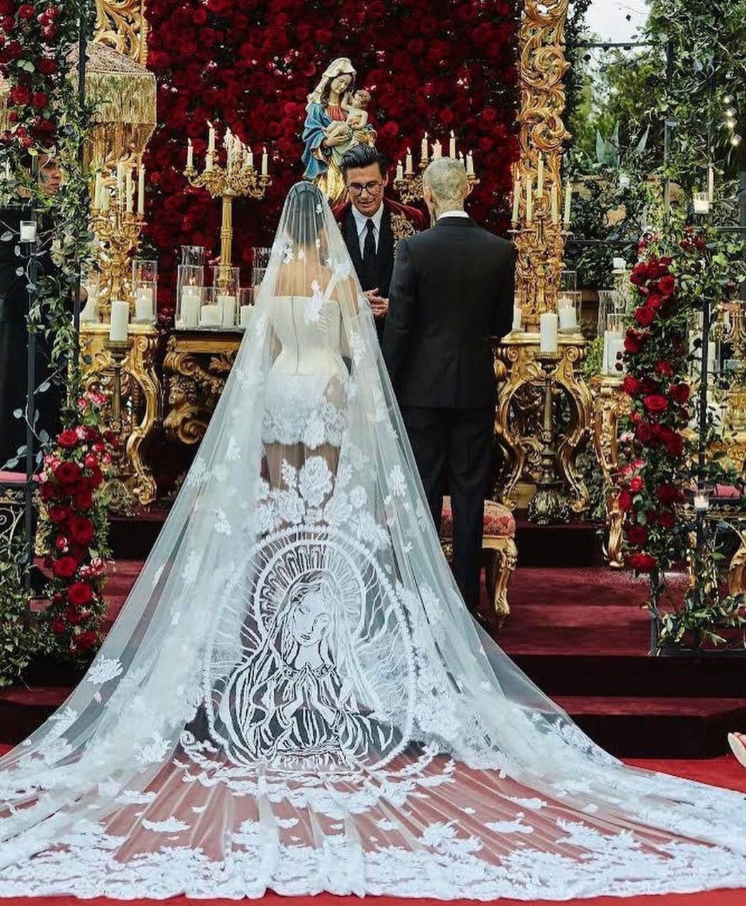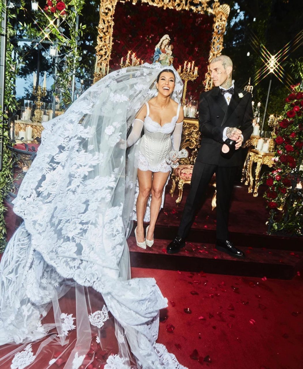 新娘 Kourtney Kardashian 身穿獨一無二的 Dolce & Gabbana Alta Moda 喱士和緞面緊身 corset 迷你連身裙,靈感來自 1960 年代的意大利內衣,並配以飄逸的頭紗。頭紗上的手工刺繡花朵靈感來自海邊小鎮的許多地中海花園,以及聖母瑪利亞,是基於 Travis Barker 的宗教肖像畫,上面寫著“family loyalty respect”,並搭配了一副薄紗手套和喱士高跟鞋。「與 Domenico 和 Stefano 一起設計我的婚紗讓我夢想成真,」Kourtney Kardashian 告訴《VOGUE》美國版;而 Travis 的黑色雙排扣西裝也是這個意大利品牌設計的。當天還有時尚攝影師 Ellen Von Unwerth 為他們拍攝婚禮照片。