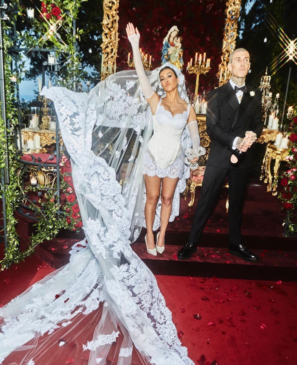 新娘 Kourtney Kardashian 身穿獨一無二的 Dolce & Gabbana Alta Moda 喱士和緞面緊身 corset 迷你連身裙,靈感來自 1960 年代的意大利內衣,並配以飄逸的頭紗。頭紗上的手工刺繡花朵靈感來自海邊小鎮的許多地中海花園,以及聖母瑪利亞,是基於 Travis Barker 的宗教肖像畫,上面寫著“family loyalty respect”,並搭配了一副薄紗手套和喱士高跟鞋。「與 Domenico 和 Stefano 一起設計我的婚紗讓我夢想成真,」Kourtney Kardashian 告訴《VOGUE》美國版;而 Travis 的黑色雙排扣西裝也是這個意大利品牌設計的。當天還有時尚攝影師 Ellen Von Unwerth 為他們拍攝婚禮照片。