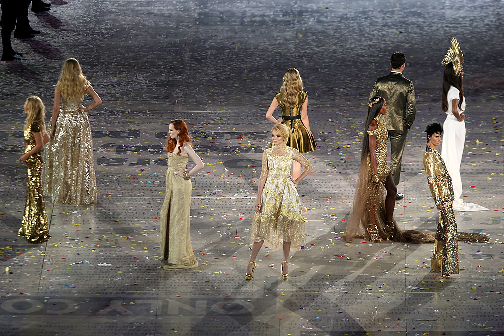 LONDON, ENGLAND - AUGUST 12: British model Stella Tennant, British model Lily Cole, British model Karen Elson, British model Naomi Campbell, British model Jourdon Dunn, British model David Gandy and British model Kate Moss perform during the Closing Ceremony on Day 16 of the London 2012 Olympic Games at Olympic Stadium on August 12, 2012 in London, England. (Photo by Clive Brunskill/Getty Images)