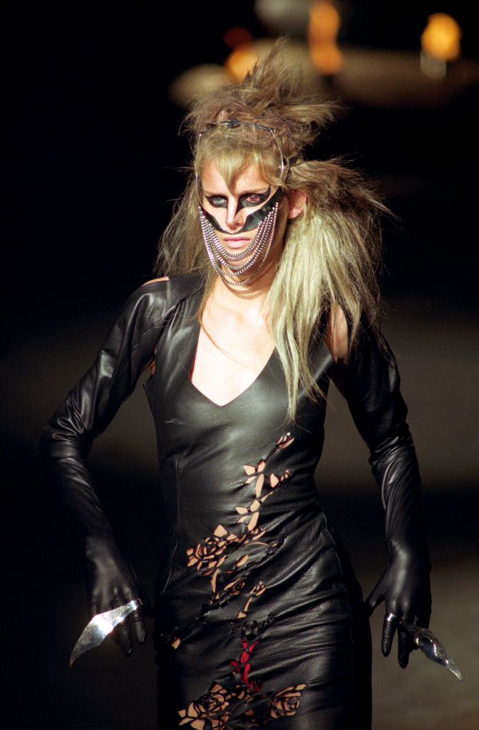 Stella Tennant takes to the catwalk in slashed leather and chains, from designer Alexander McQueen, on the fifth day of London Fashion Week. (Photo by Stefan Rousseau - PA Images/PA Images via Getty Images)