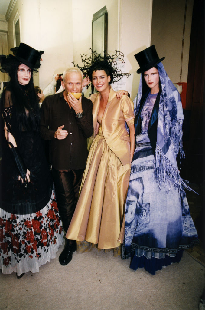 Nadja Auermann, Jean-Paul Gaultier, Linda Evangelista et Stella Tennant dans les coulisses du défilé Prêt-à-Porter Printemps-Eté 98 le 16 octobre 1997 à Paris, France. (Photo by Pool PAT/ARNAL/Gamma-Rapho via Getty Images)
