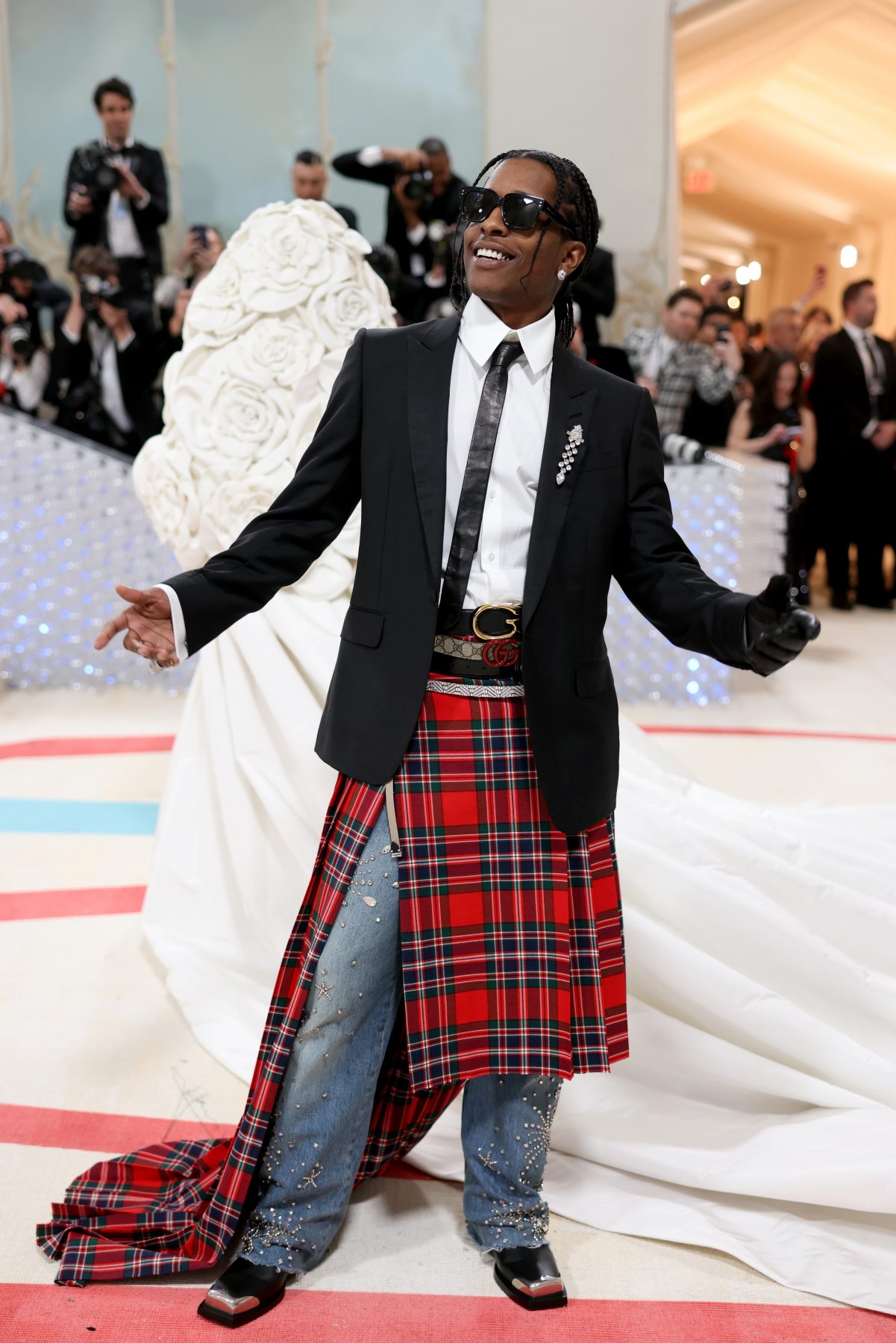 與此同時,A$AP Rocky的造型則是受老佛爺本人風格影響,以最經典的黑色筆挺西裝搭配白襯衫、黑領帶亮相,包括腰間的紅色格紋短裙在內,全身造型皆出自Gucci。