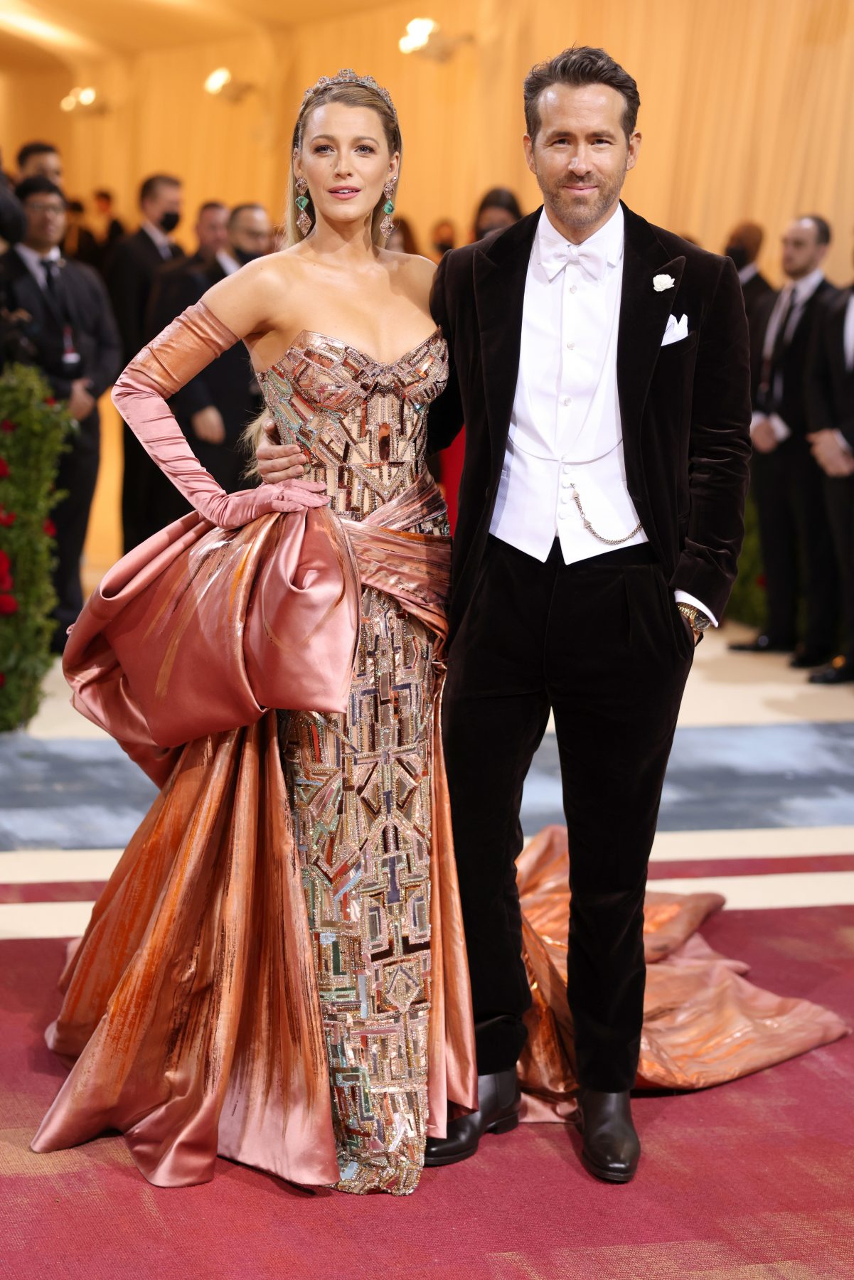 2022 Met Gala,聯合主席之一的時尚夫婦 Blake Lively 與老公 Ryan Reynolds 分別穿上 Versace 會變色的閃石高訂連身裙和黑白西裝造型。