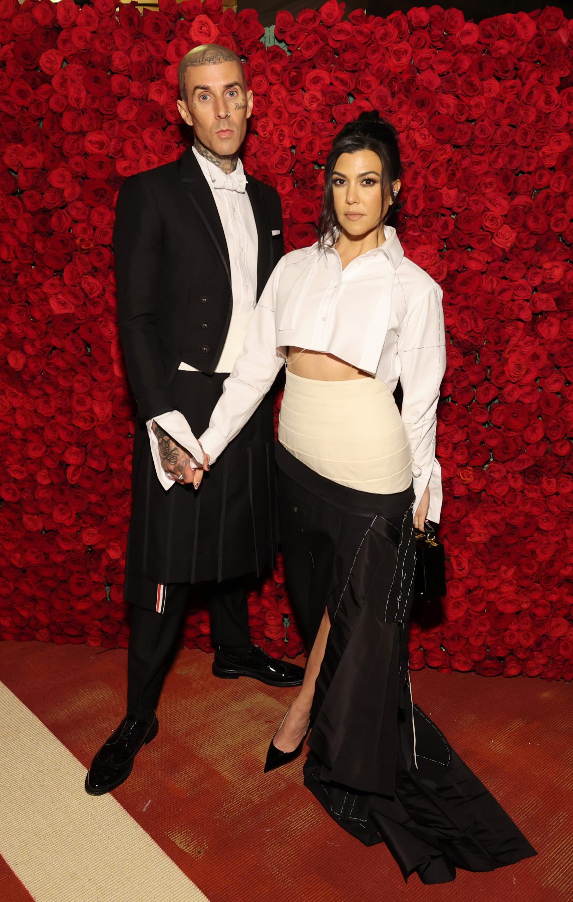 Kourtney Kardashian 和 Travis Barker 身穿 Thom Browne 裙裝造型亮相2022 Met Gala紅地毯。