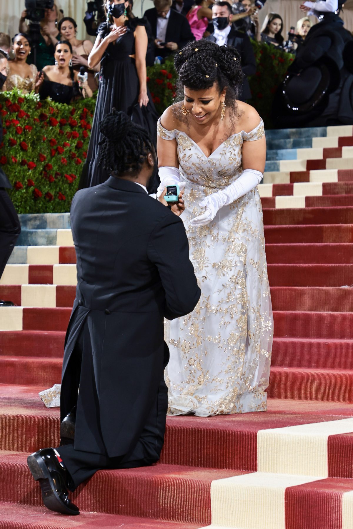 紐約市文化事務部專員 Laurie Cumbo 在 2022 Met Gala 接受前紐約州議會候選人 Bobby Digi Olisa 的求婚。
