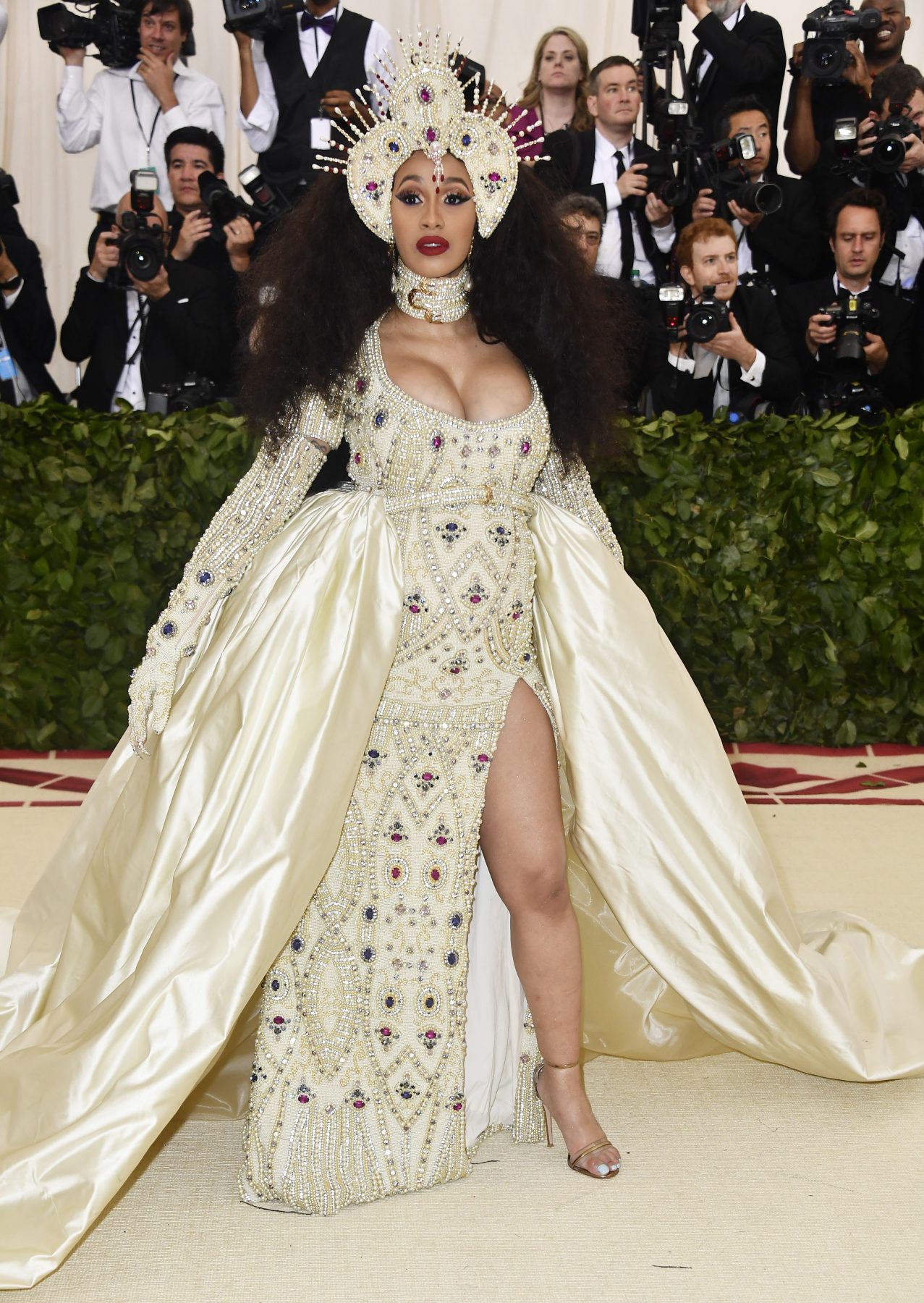 Cardi B 在她第一次參加 Met Gala 《Heavenly Bodies: Fashion & The Catholic Imagination》盛宴上,Jeremy Scott 採用佈滿大量的珍珠、紅寶石、水晶等立體刺繡打造出 Moschino 女王級造型。而身懷六甲的 Cardi B 儘管是拱起的肚子,都能輕易地駕馭鑲滿寶石輪廓的晚裝;而左邊開衩的細節設計露出長腿襯托了 Cardi B 豐滿奢華的光芒,讓一眾觀眾都瞠目結舌。